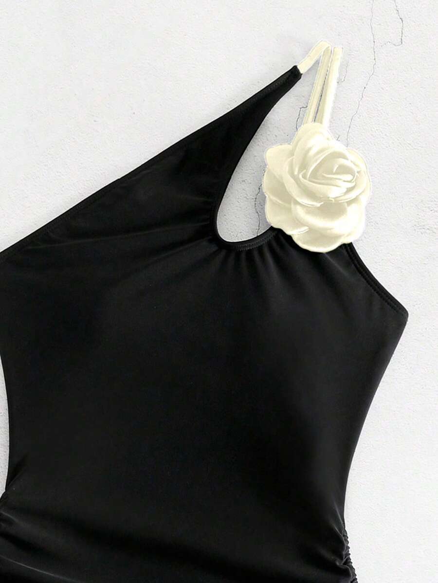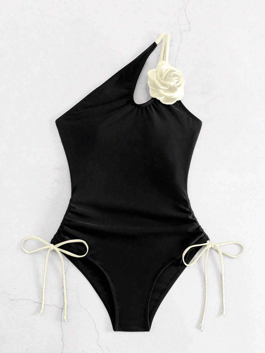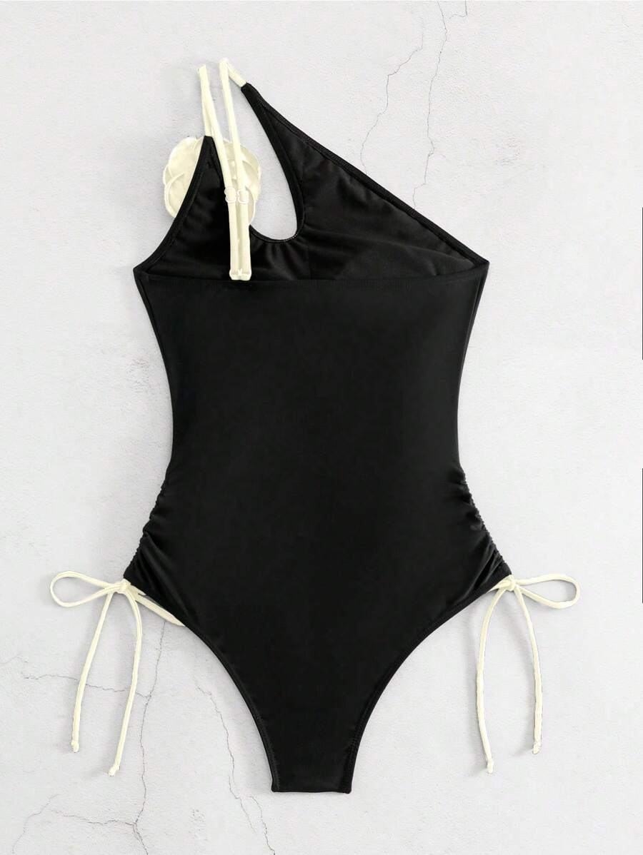 レディース 水着 ワンピース 花の装飾が施されたワンショルダーカラーブロックビーチ水着、引き締め効果抜群の引き紐つき、3Dフラワー