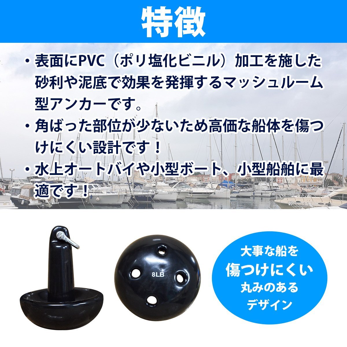 角ばった部位が少ないタイプのマッシュルーム型なので、船体に傷をつけにくい設計です!