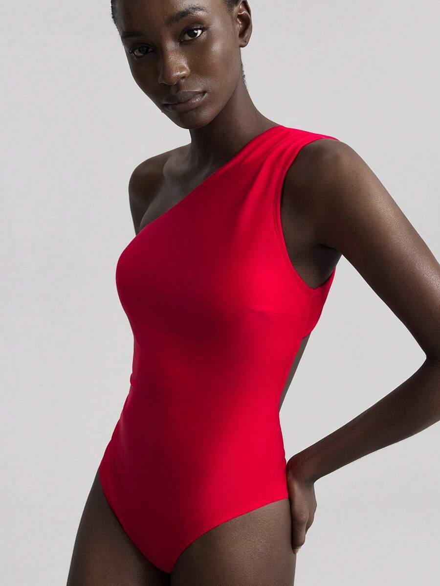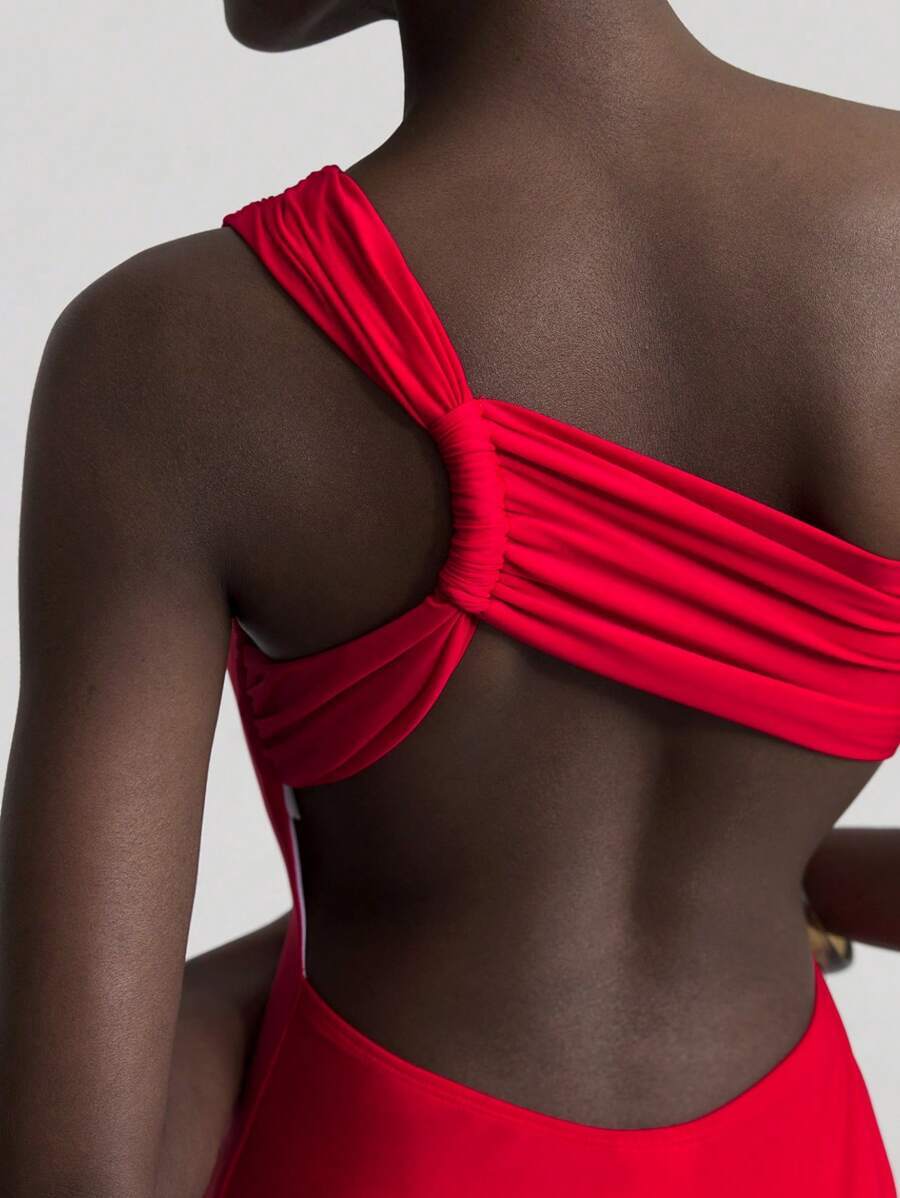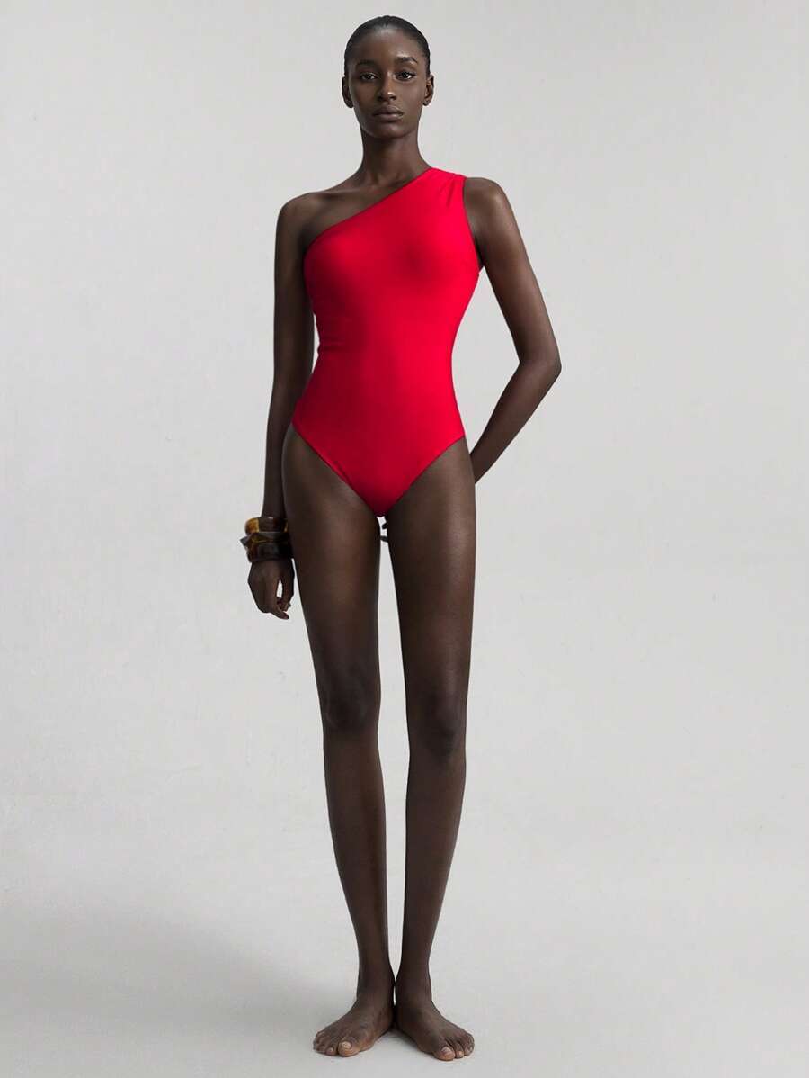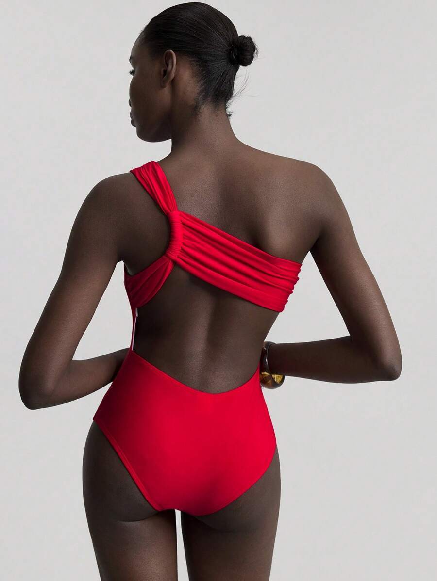 レディース 水着 ワンピース アシンメトリー ワンショルダー デザイン レッド バックレス バケーション水着、レディースリゾートウ