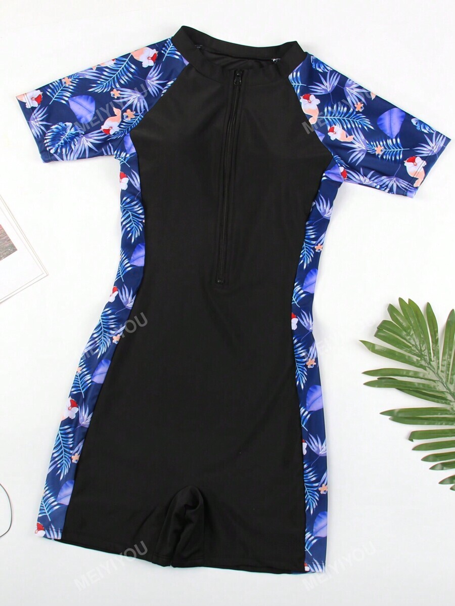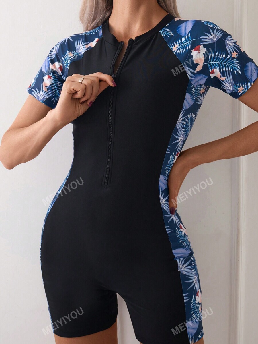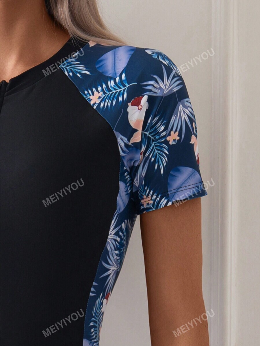 レディース 水着 ワンピース レジャーでファッショナブルなトロピカル柄切替ワンピース水着 夏
