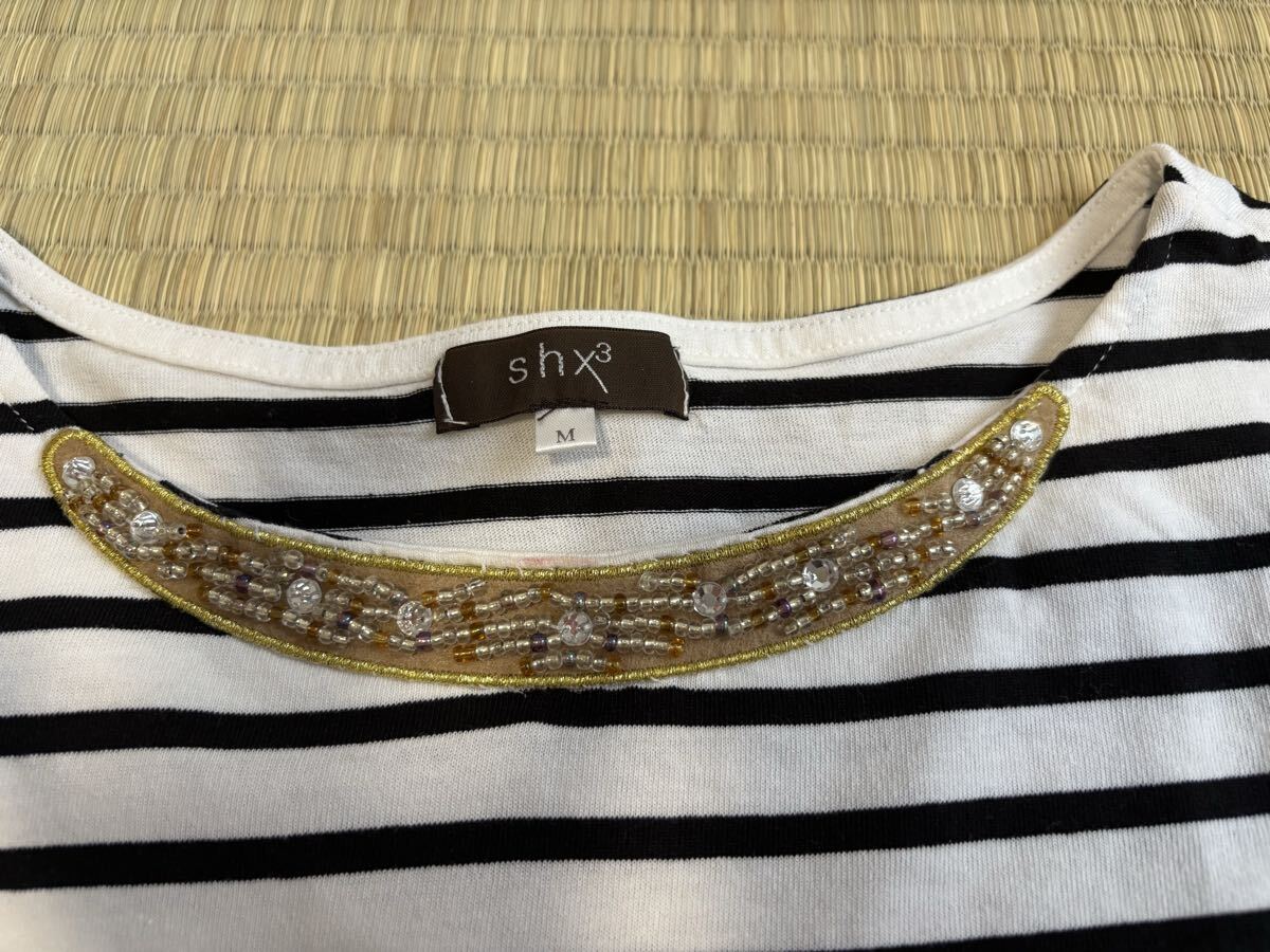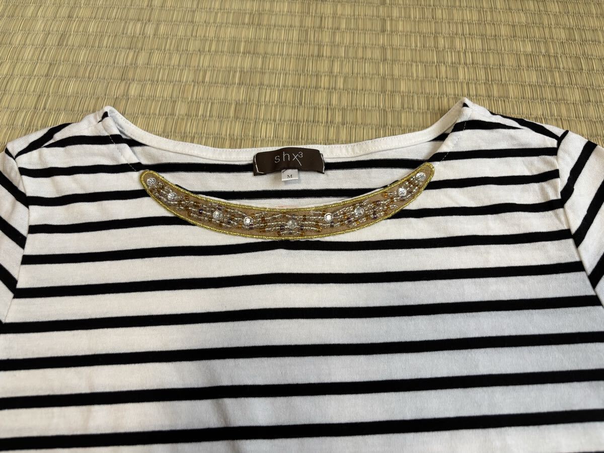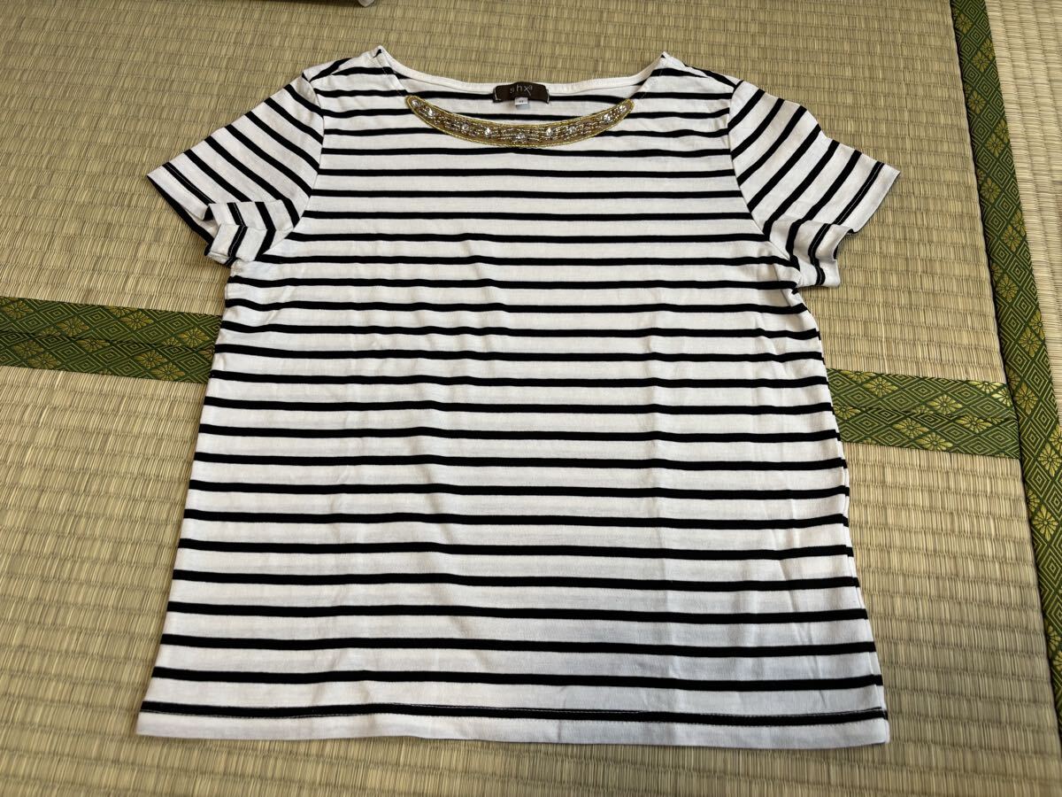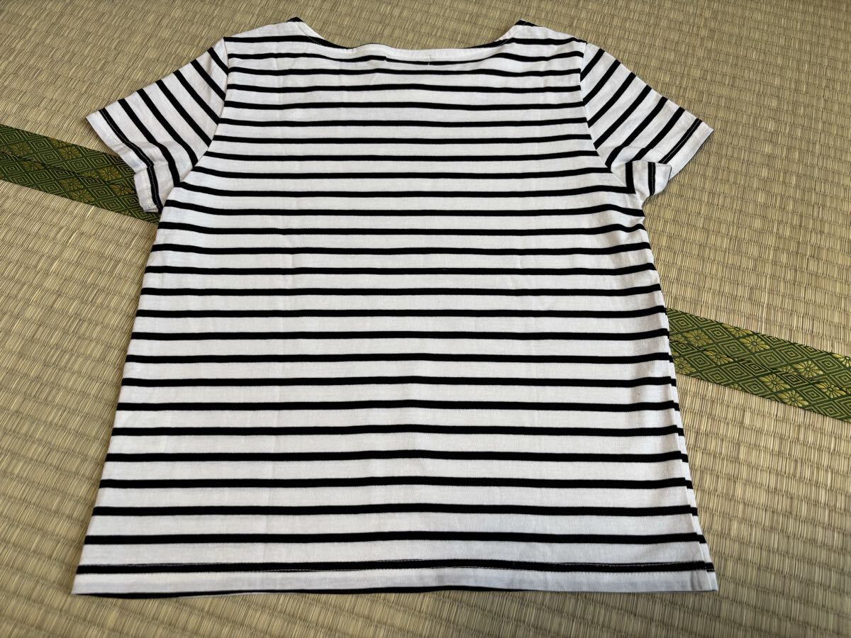 ☆ブランド・・・ニッセン ☆お色・・・白地に黒のボーダー柄 ☆サイズ・・・M 平置きの状態で、身幅・・・43cm 着丈・・・51cm 袖丈・・・15cm です。 素人寸法ですので参考程度にお考え下さい。 ☆胸元にビーズがあしらわれたデザインの半袖カットソーです。 ☆試着程度のほぼ未使用品ですが、自宅での保管になりますので多少の生地の馴染み、色褪せ、細かい毛玉等の使用感があるかと思います。 ご理解の上ご入札下さい。 ☆細かいことをお気にされる方、神経質な方は入札をご遠慮下さい。 ☆自己紹介も必ずお読み下さい。
