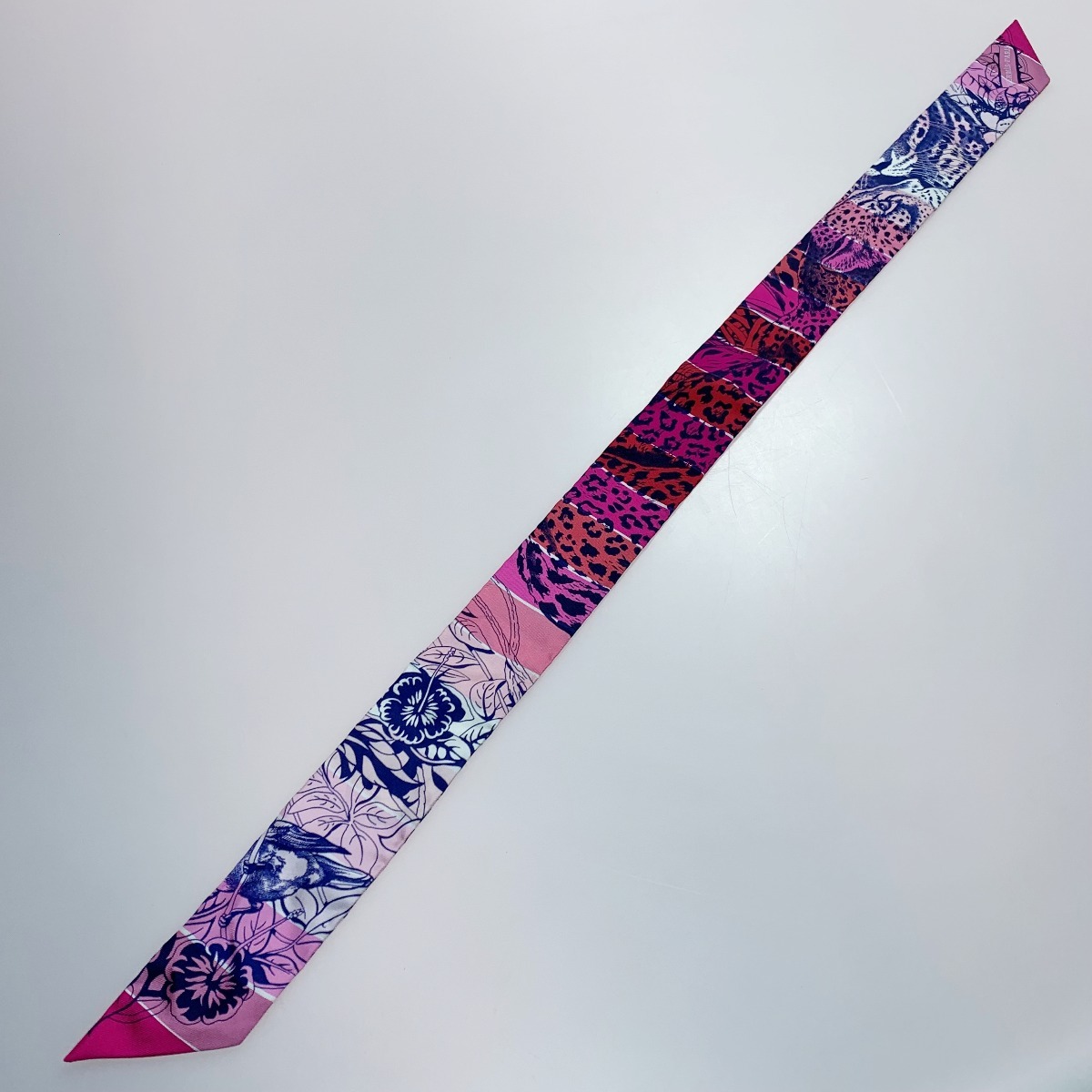【商品名】中古 HERMES エルメス レオパード シルク100% ツイリー レッド×ローズ シルクスカーフ 傷や汚れあり