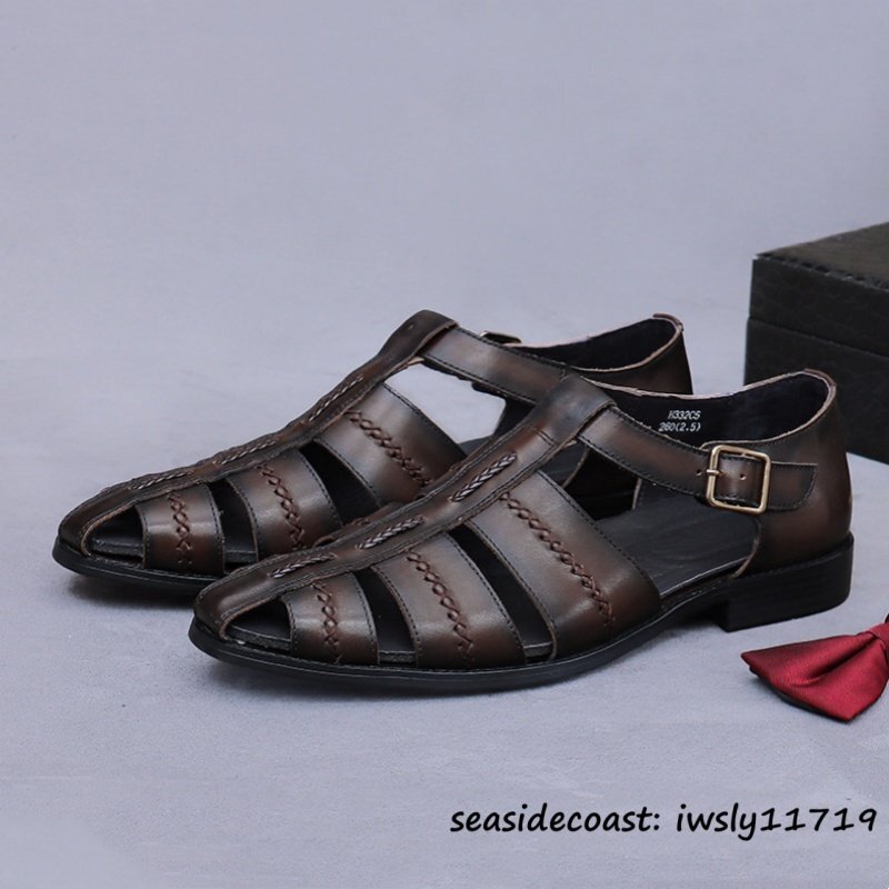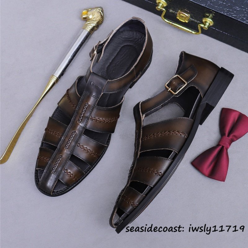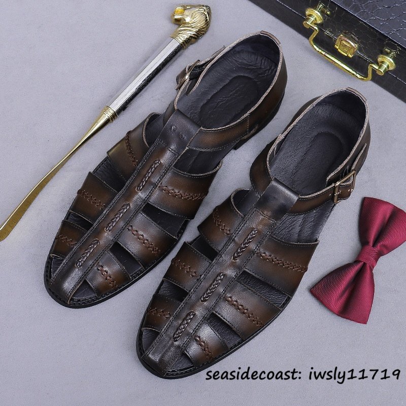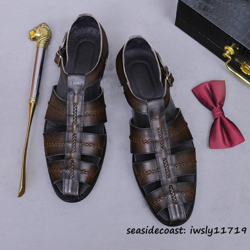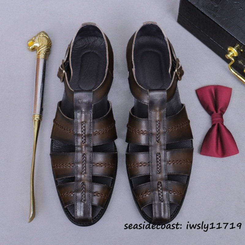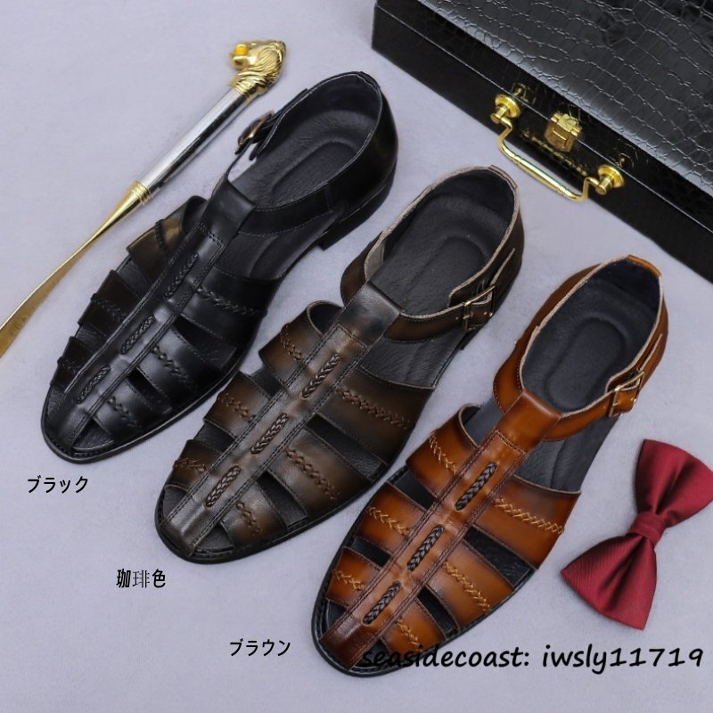 定価10万★新品 サンダル スリッパ 本革 レザーシューズ メンズ 職人手作り 透かし彫り メッシュ ビジネスシューズ 通気性 珈琲色 27.5cm