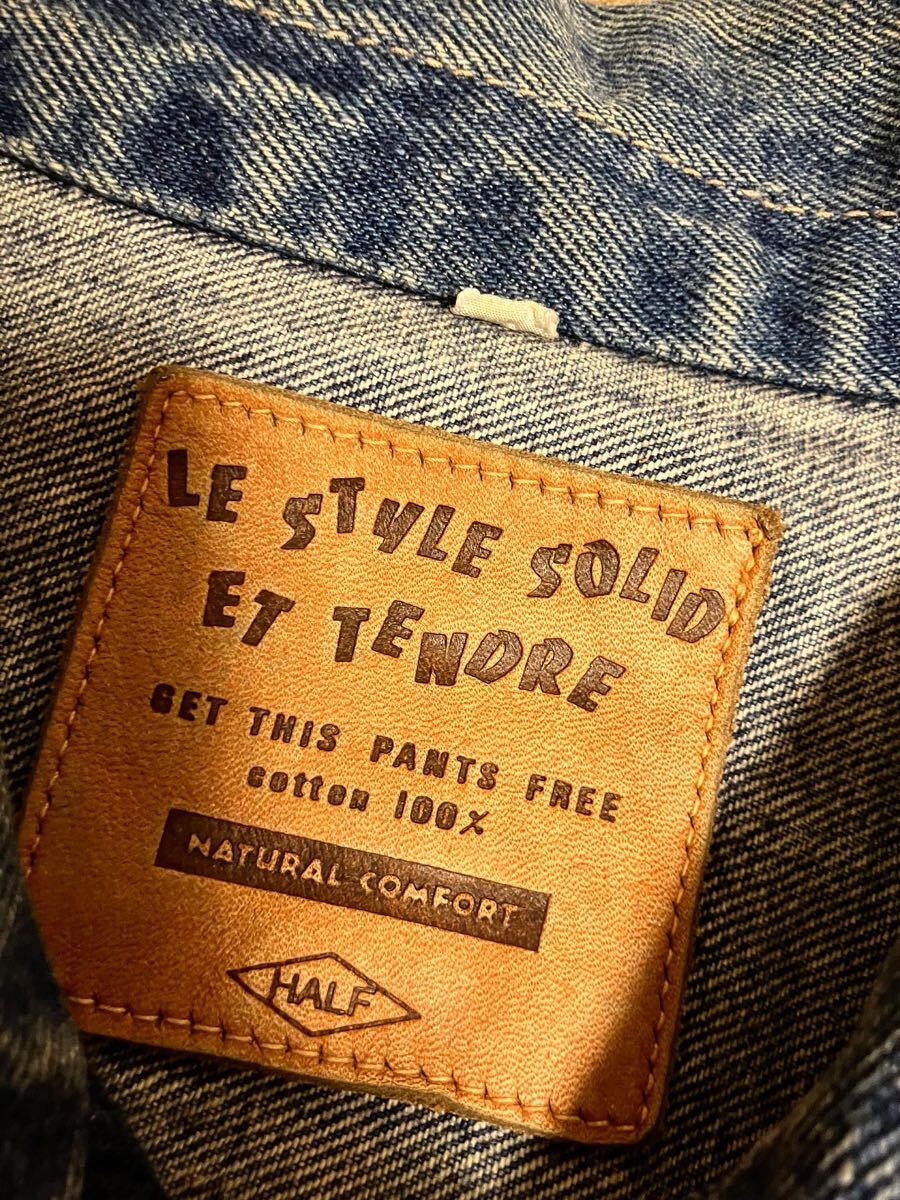 フランス語で「LE STYLE SOLID ET TENDRE(堅牢かつ柔和なスタイル)」と刻まれたレザーパッチや、「GET THIS PANTS FREE」といった謎めいたコピーに象徴されるように、シンプルなワークウェアとは一線を画す存在感を放ちます。