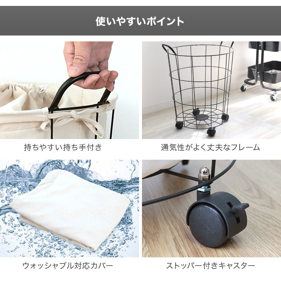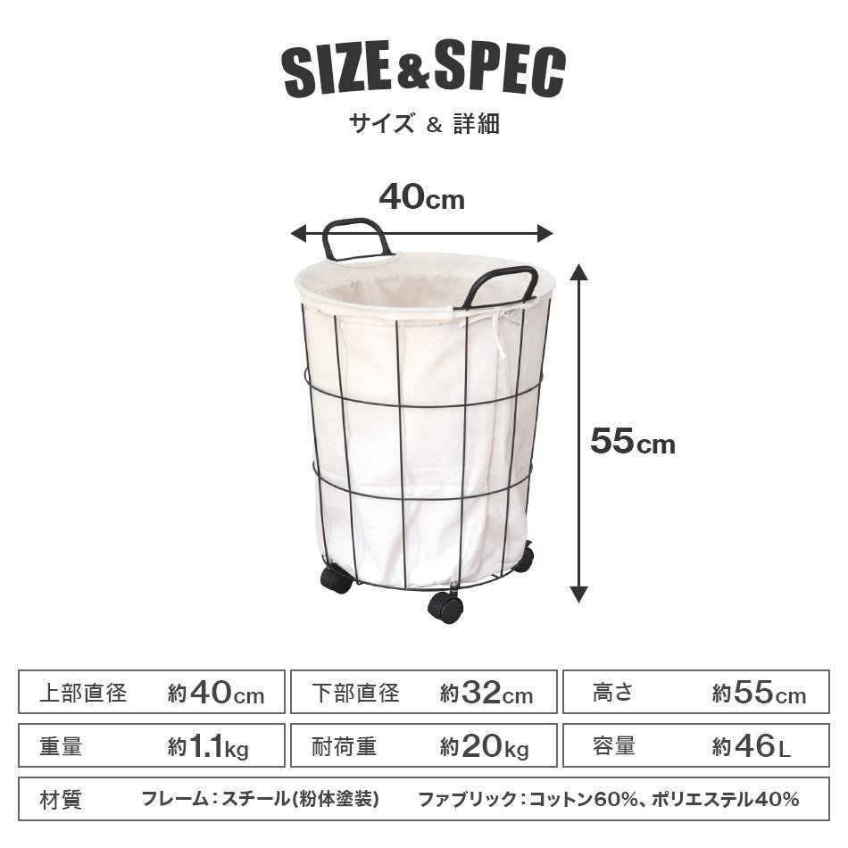 直径約40cmの大きな取り出し口と約46Lの大容量で、 多くのものを収納できます。 ウォッシャブル対応のシンプルな布地カバーはきんちゃく仕様になっているので、 中に入れたものを隠すことができます。 通気性が良く丈夫なフレームは、持ち手・キャスター付きなので、 ラックごとの移動もスムーズです。 ランドリー以外にキッチンの食品ストッカー、リビングの雑貨入れ、おもちゃ収納にも使えます! 【商品仕様】 ・カラー:ホワイト ・サイズ:(約)上部直径40×下部直径32×高さ55cm ・重量:(約)1.1kg ・容量:(約)46L ・耐荷重:(約)20kg ・素材: フレーム:スチール(粉体塗装) ファブリック:コットン60%、ポリエステル40% 【注意事項】 ・スチール製の為、浴室ではご使用いただけません。 |