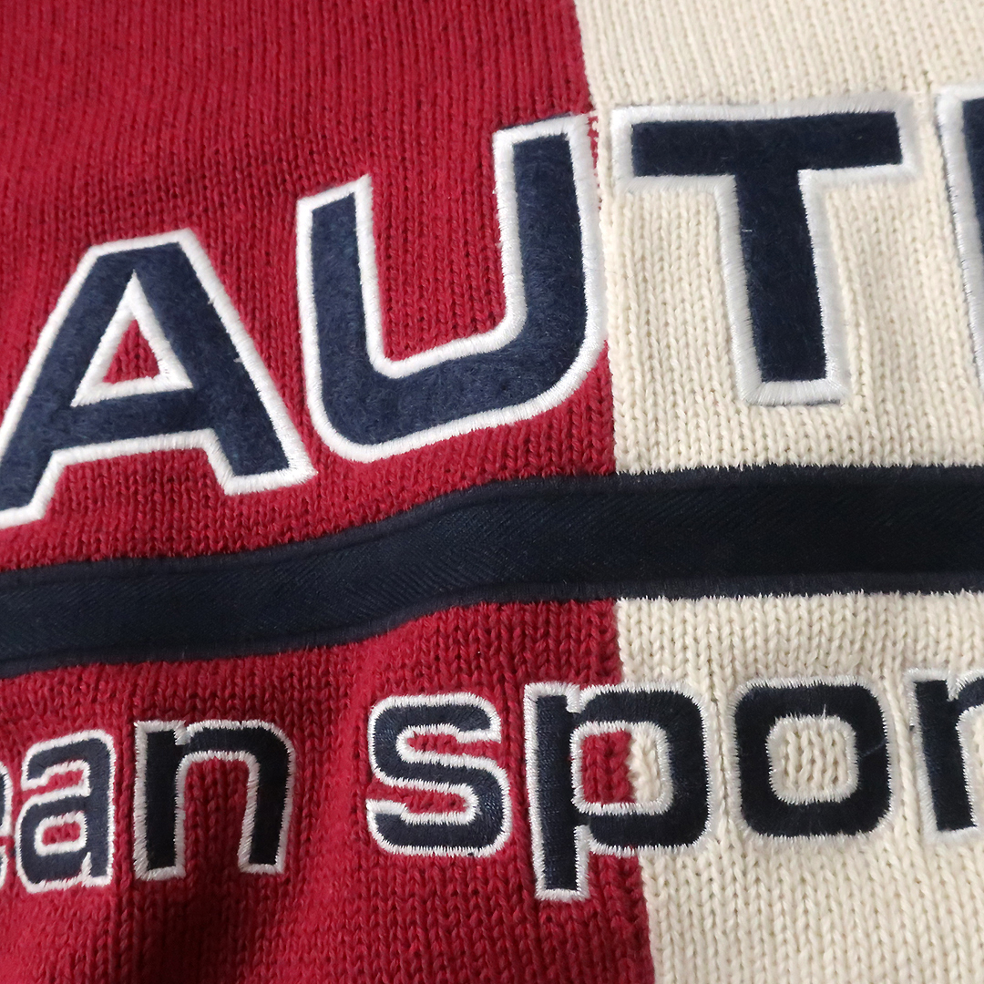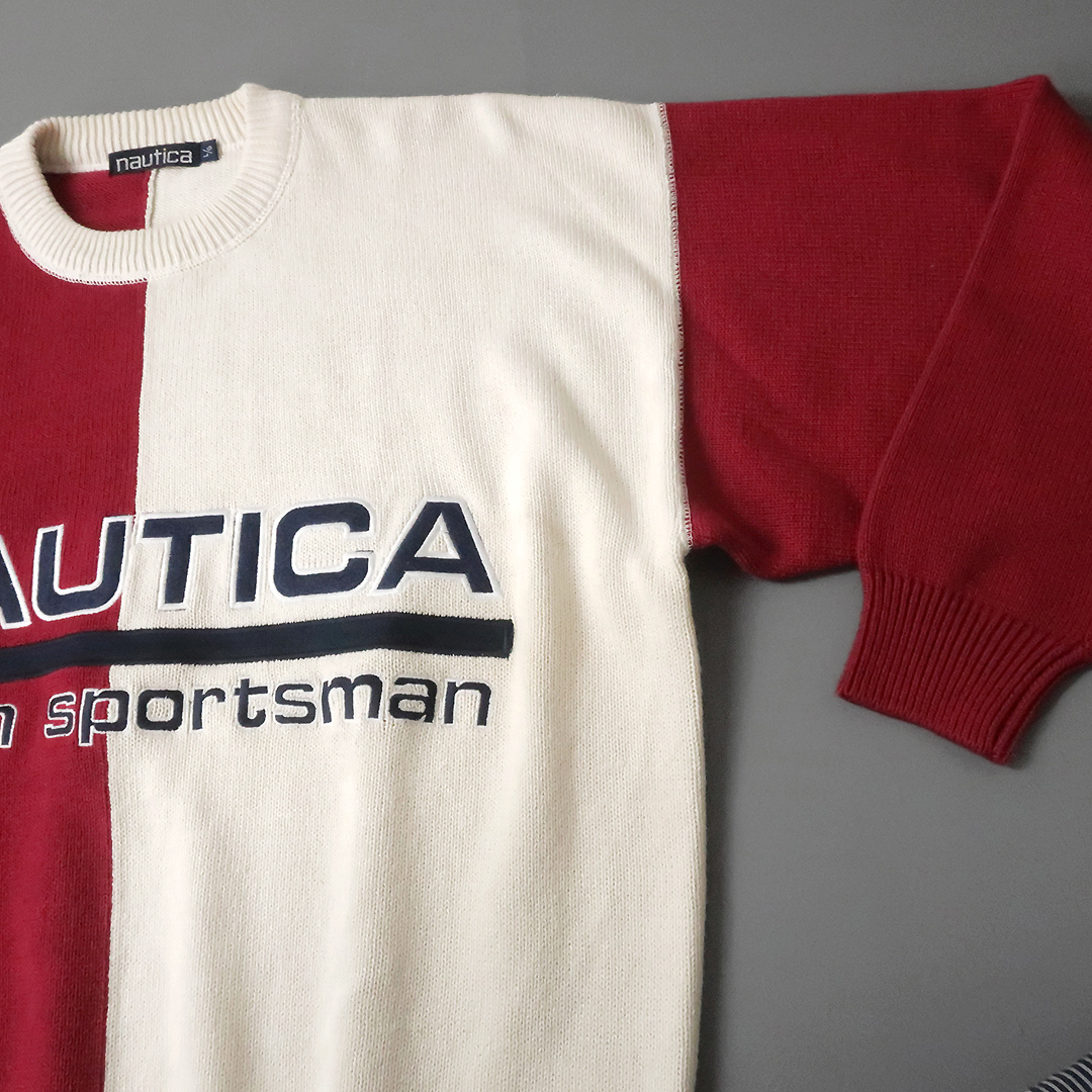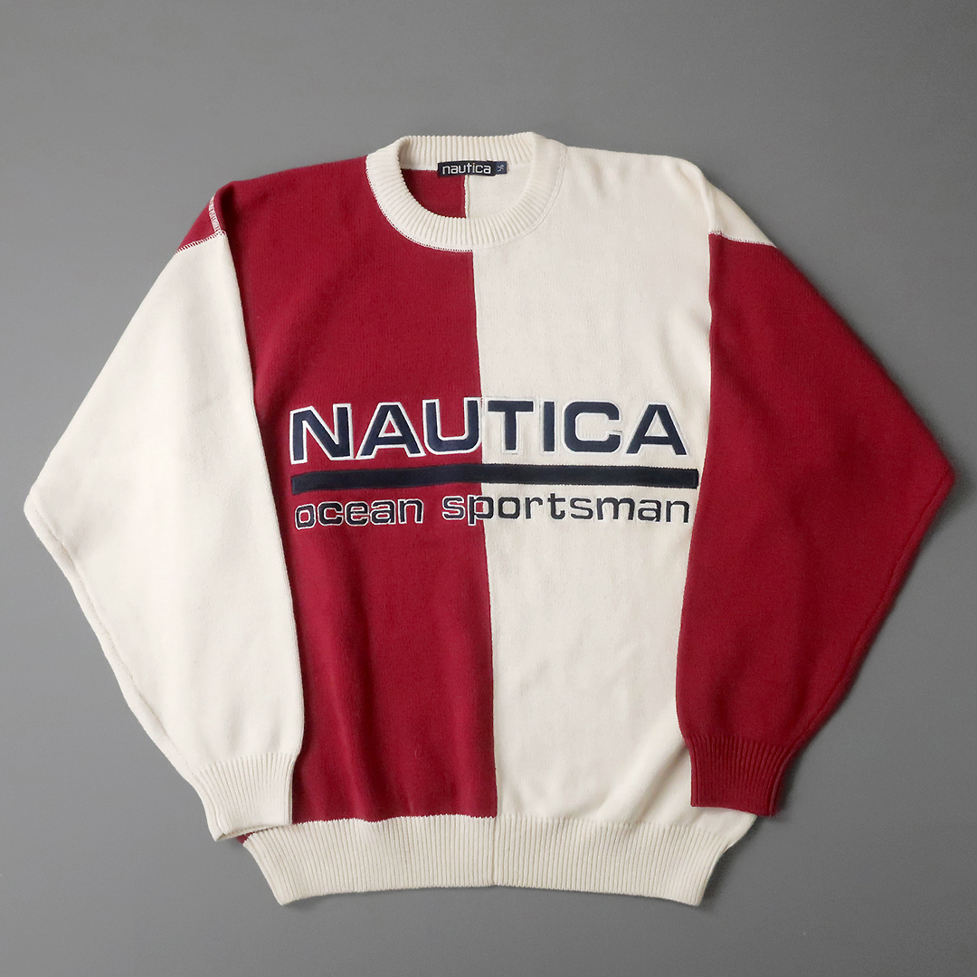90s nautica ノーティカ 2TONE/ビッグロゴ刺繍 クルーネックセーター 90年代HipHop (Lサイズ)