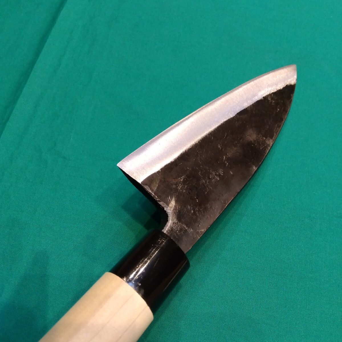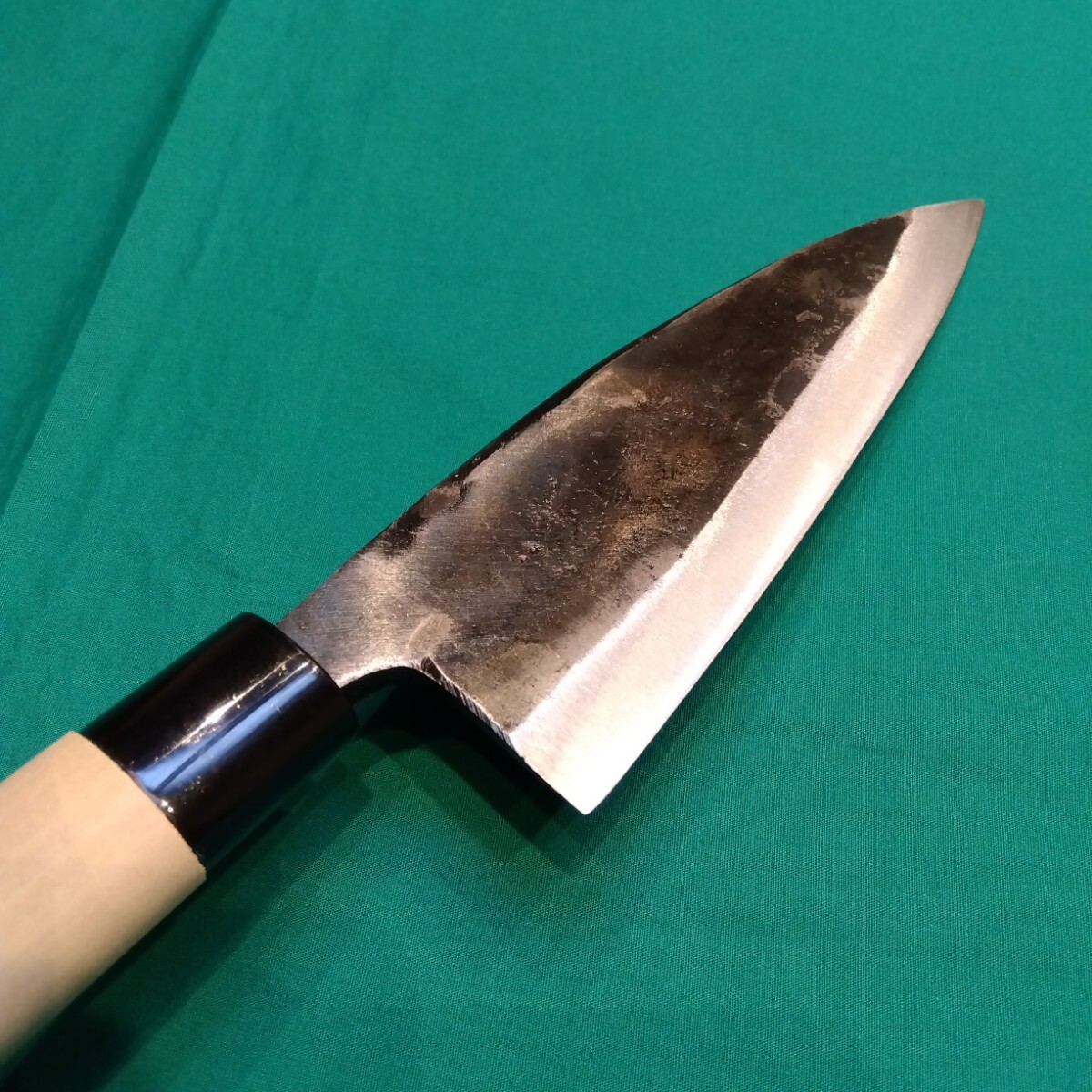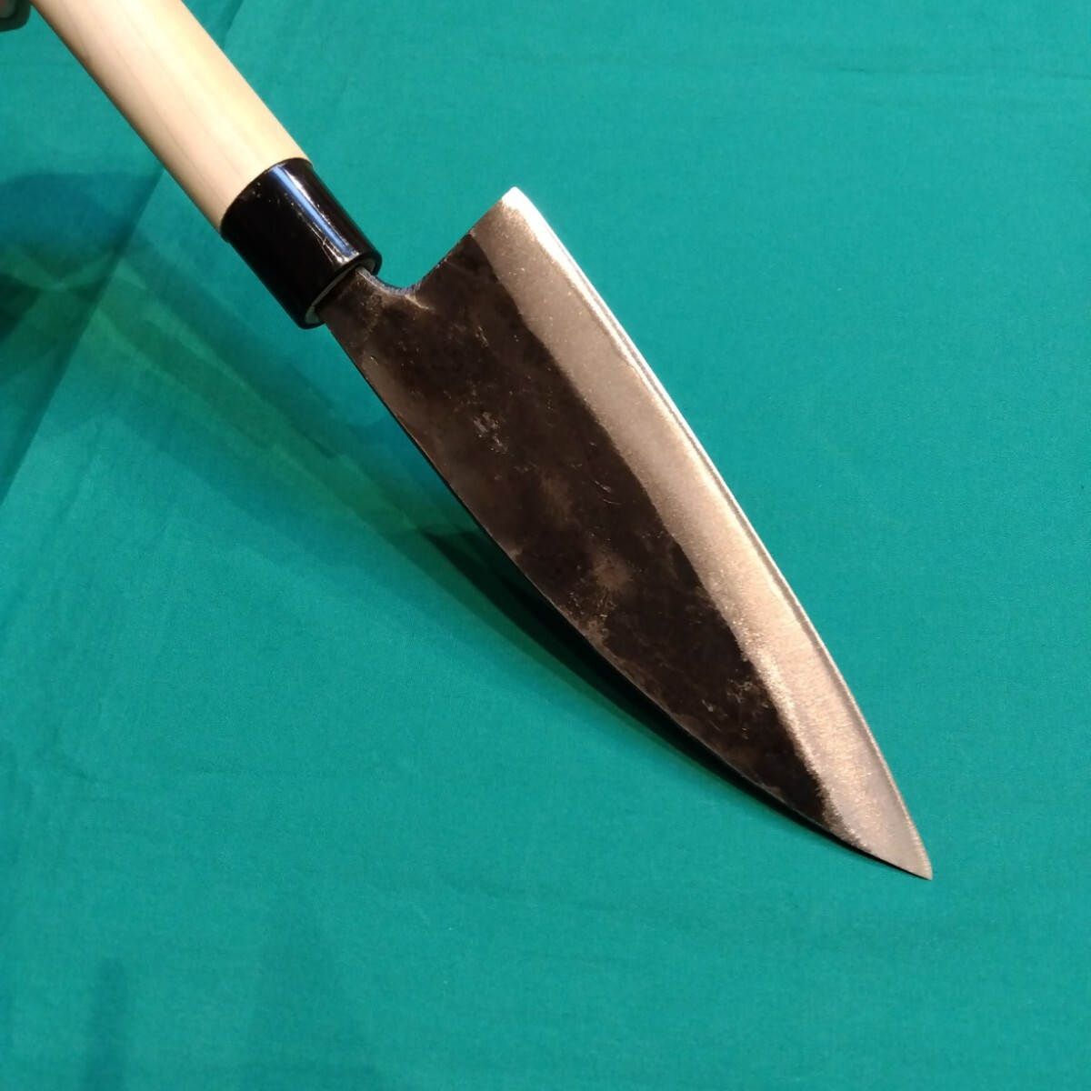 土佐刃物、手打ち鍛造の出刃包丁です。黒打ち、両刃が特徴です。箱が付きませんので、格安にしています。
