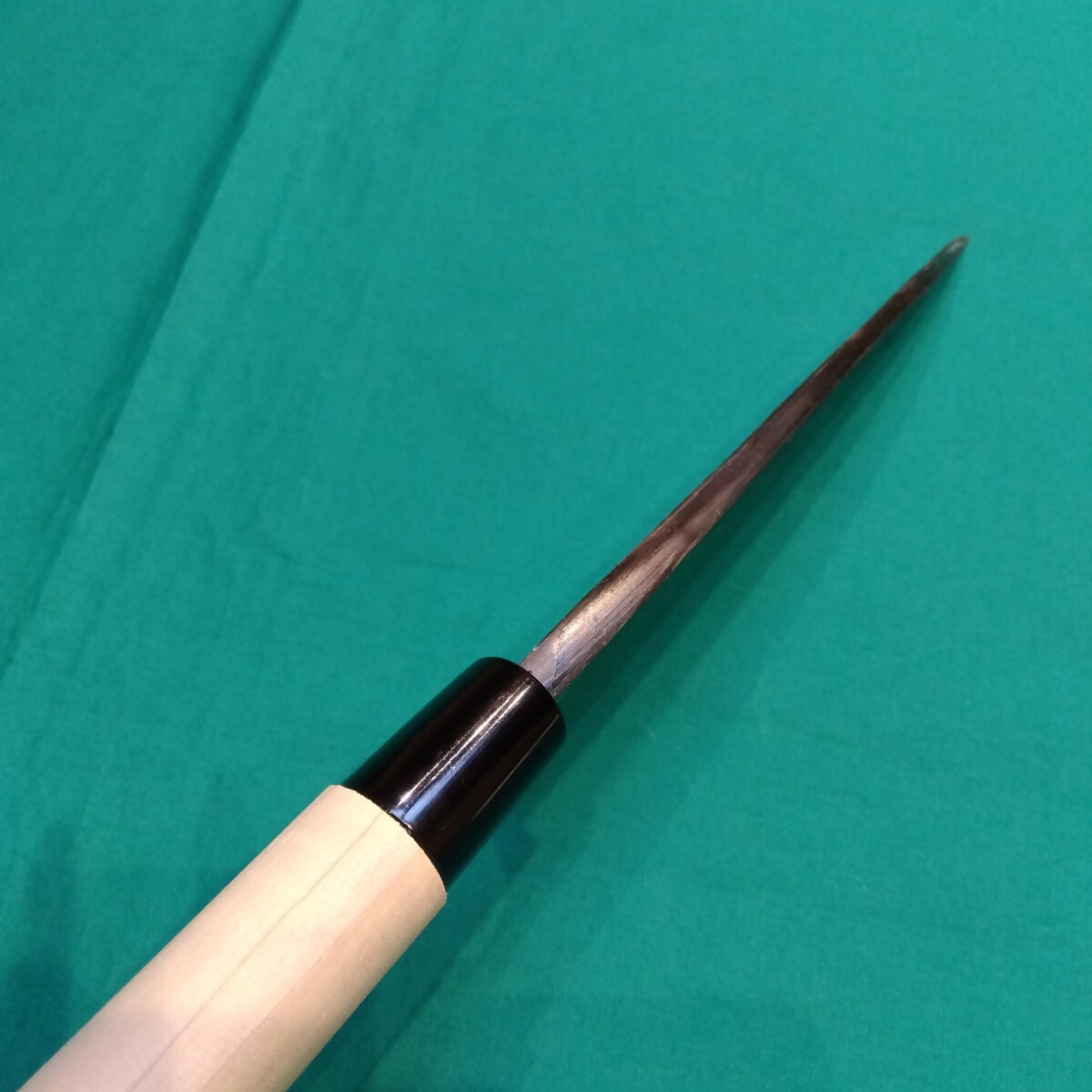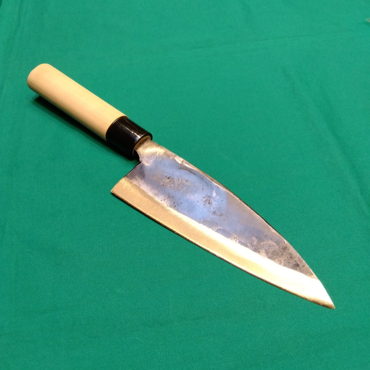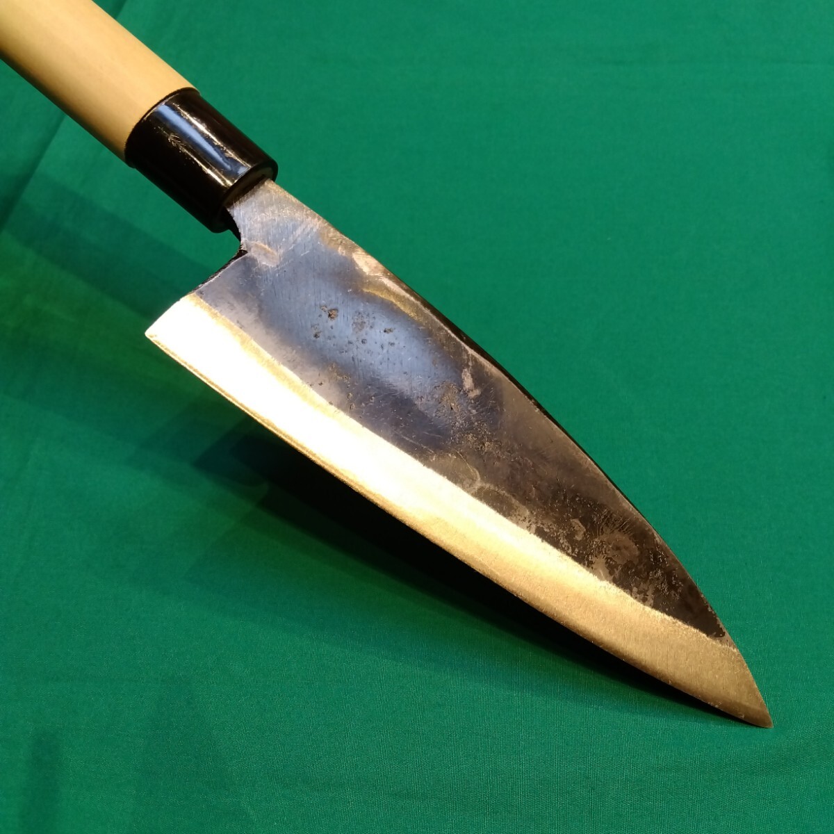 土佐刃物、手打ち鍛造の出刃包丁です。黒打ち、両刃が特徴です。箱が付きませんので、格安にしています。