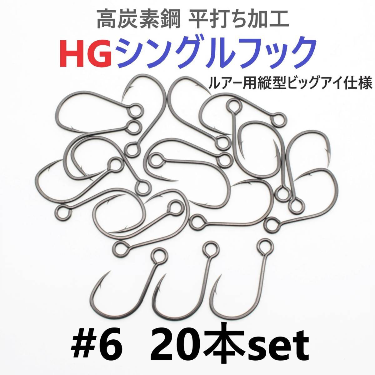 【送料150円】高炭素鋼 平打ち加工 ハイグレードシングルフック #6 20本セット ソルト対応 ブラックニッケルメッキ 縦アイ ビッグアイ仕様