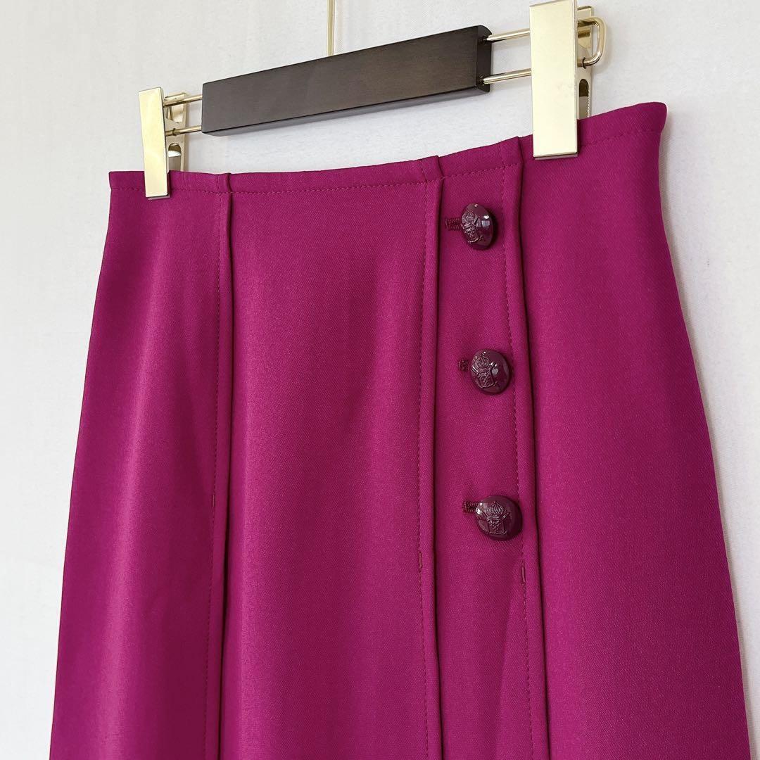 すっきりとしたAラインシルエットのスカートは、イレギュラータック仕様で、艶のある塗装した釦がデザインポイント。長すぎない着丈なので、ロングブーツ合わせもバランス良く着用していただけます。イレギュラータックで大人っぽい印象に仕上げました。