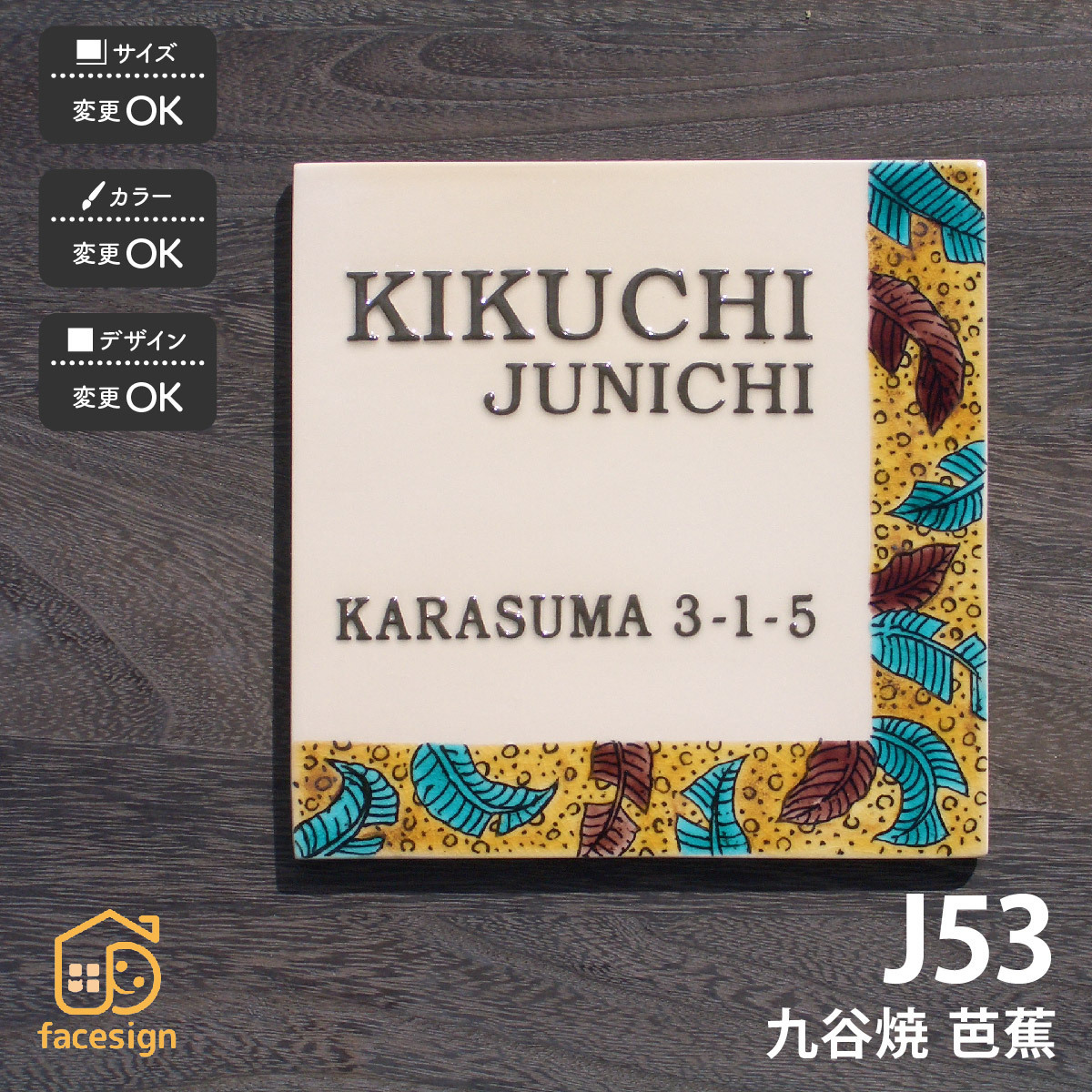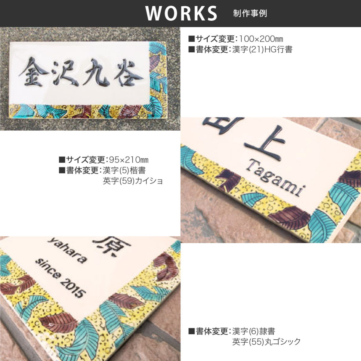 商品詳細 | 九谷焼は石川県、加賀が誇る伝統工芸。こちらは九谷五彩(赤・紺青・緑・紫・黄)を使用し、正式に石川ブランド製品に認定された九谷焼陶板表札です。上絵具の持つ本来の良さを引き出し、表現したいという願いから生まれた、大柄な植物の葉をモチーフにした表札です。 |
