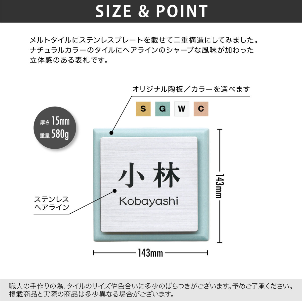 | 商品詳細 | メルト表札のタイルにステンレスプレートをのせて二重構造にしました。ナチュラルカラーのタイルにヘアラインのシャープな風味が加わった、立体感のある表札です。 |
