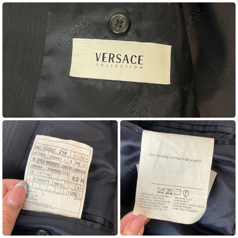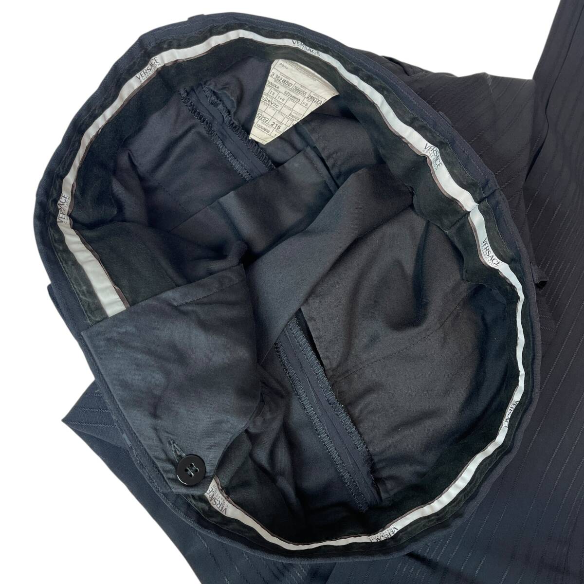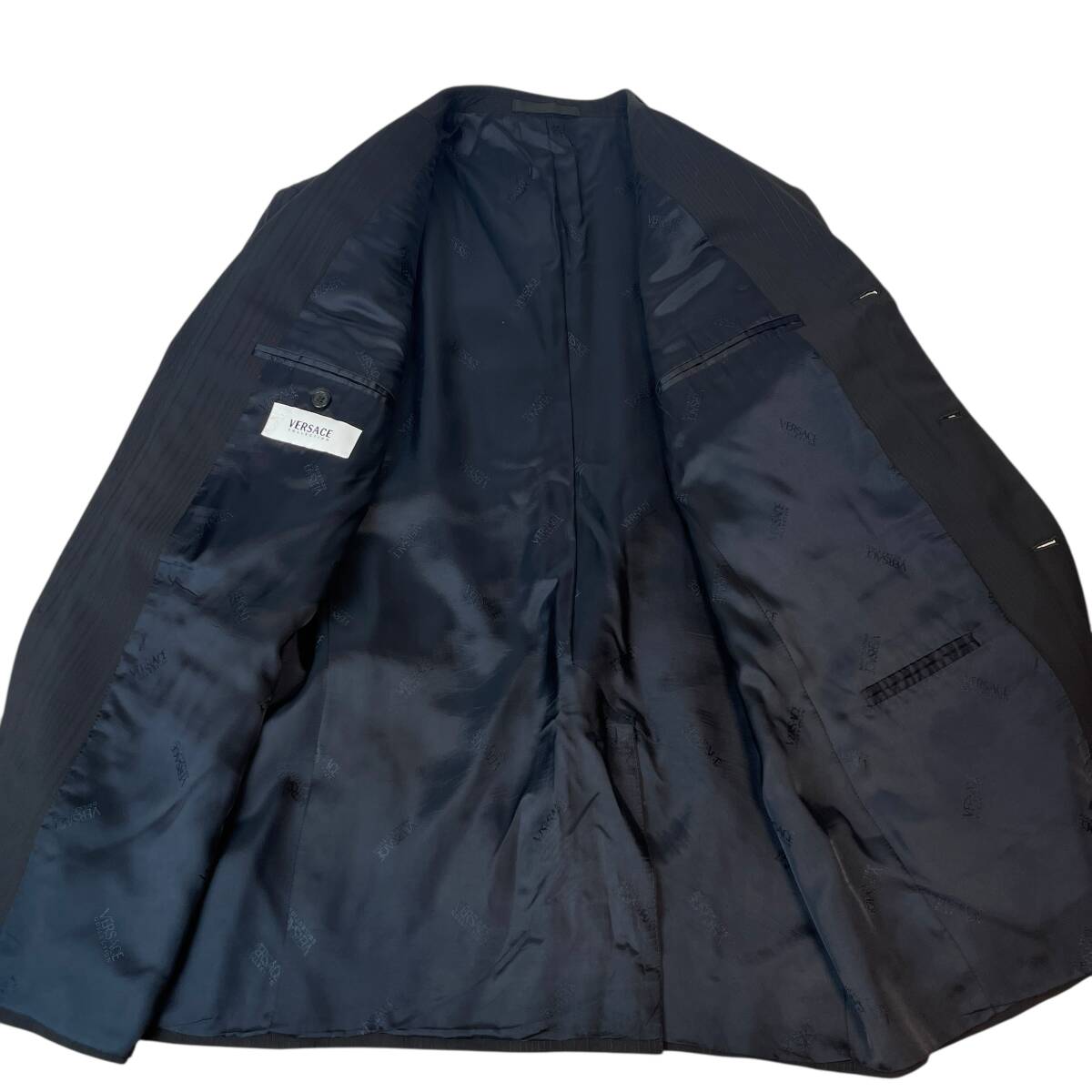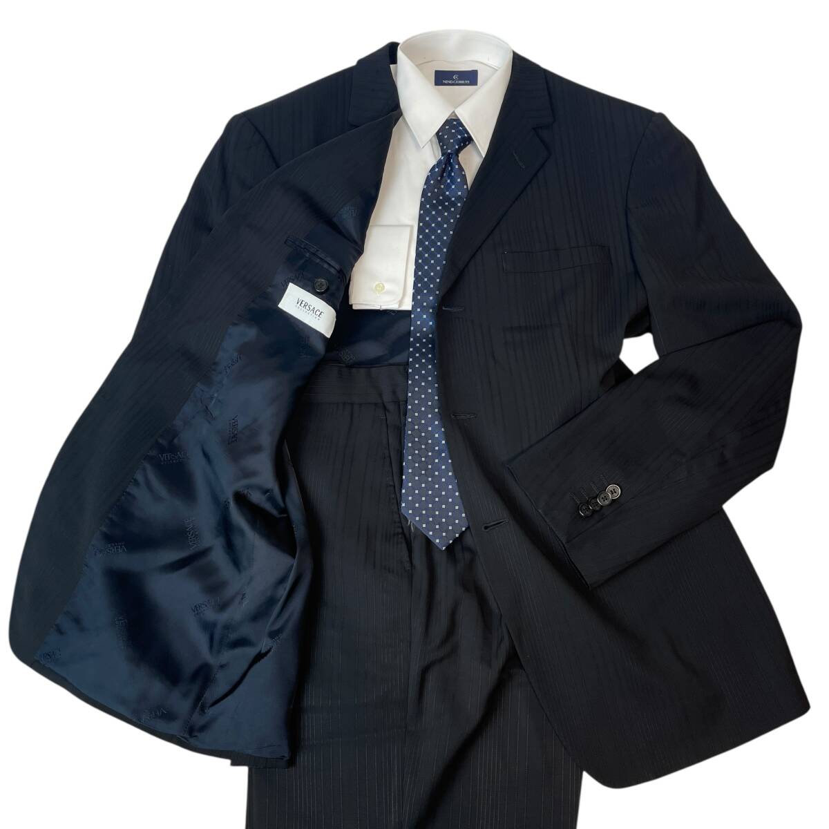 美品 希少52 VERSACE 3057 スーツ セットアップ ストライプ 裏地 総柄 ロゴ 3B XXL ヴェルサーチ ビジネス 最高級 ブラック 黒 メンズ