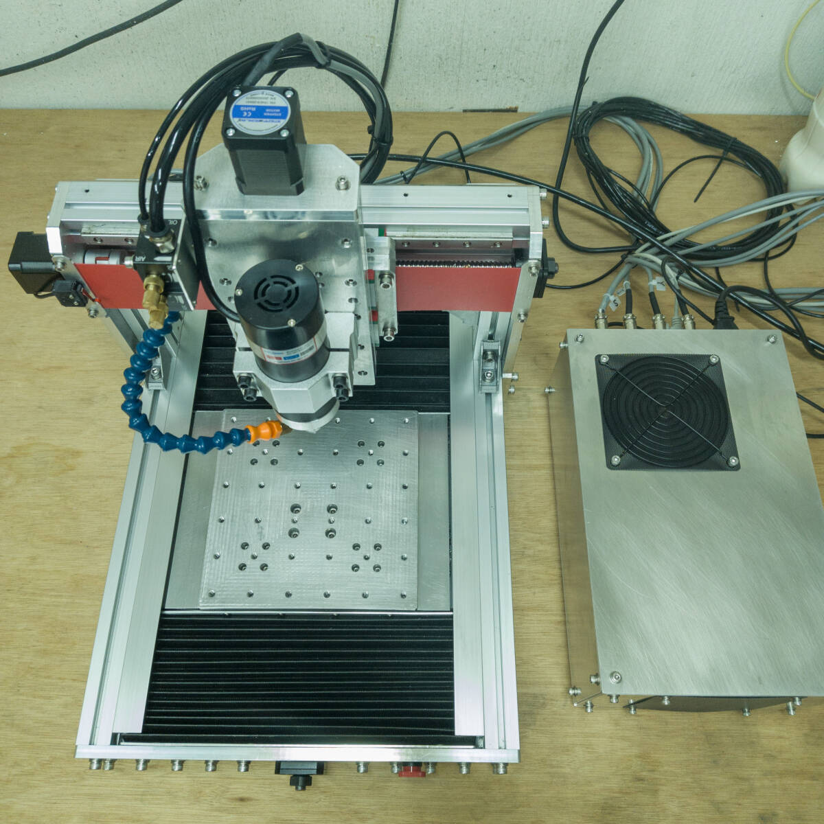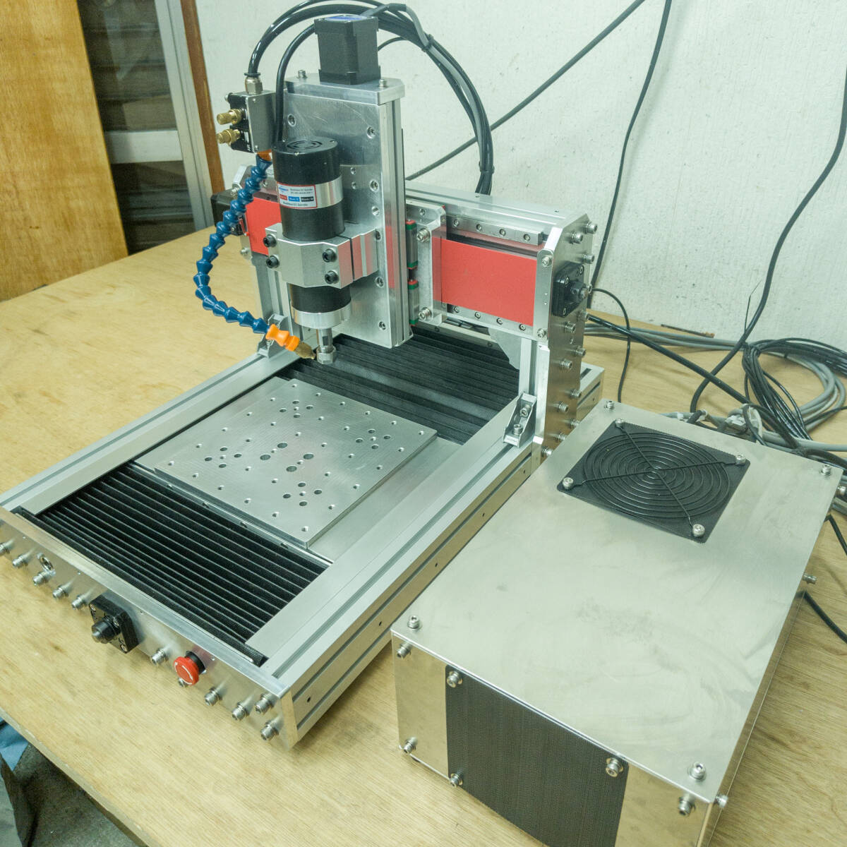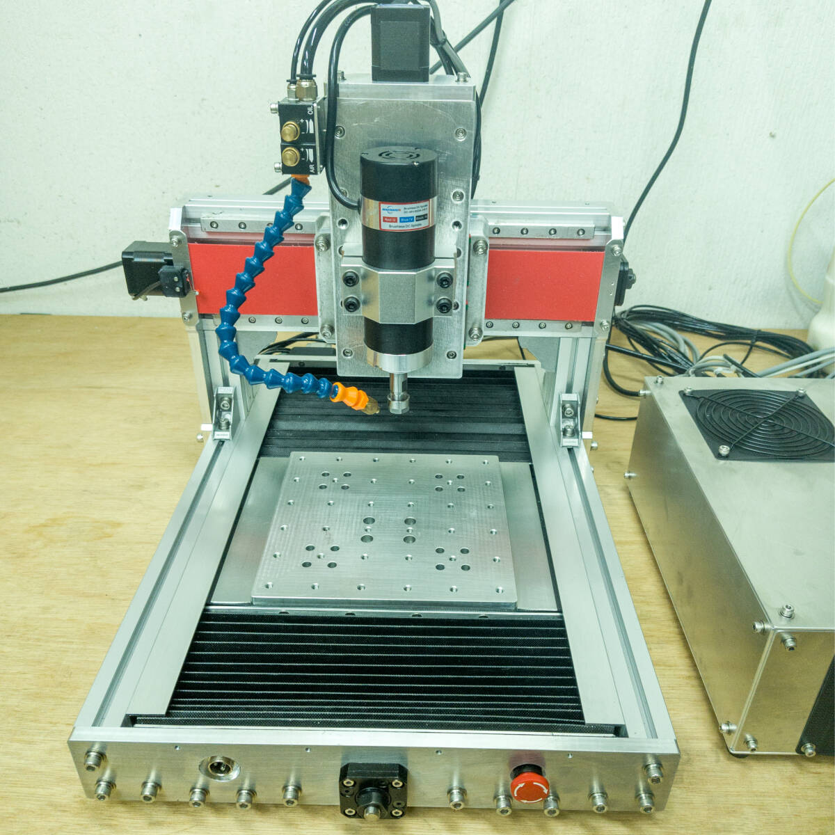 全軸ボールねじ・リニアガイドを使用し、600Wの高出力スピンドルを搭載したアルミ・鋼材の加工に対応した卓上CNCフライスになります。卓上CNCフライスとしては破格の加工性能となっています。