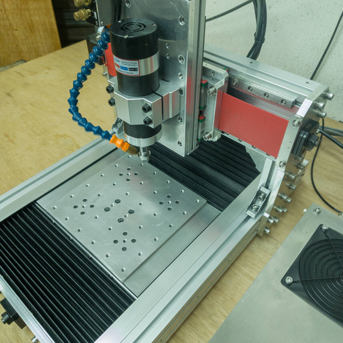 1.全軸にリニアガイドを使用しているので、小型のCNCフライスながらアルミや鋼材の加工を行える剛性を確保しています。