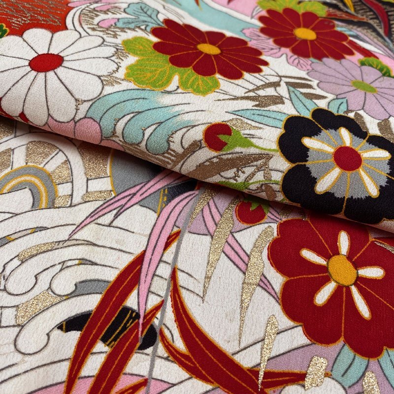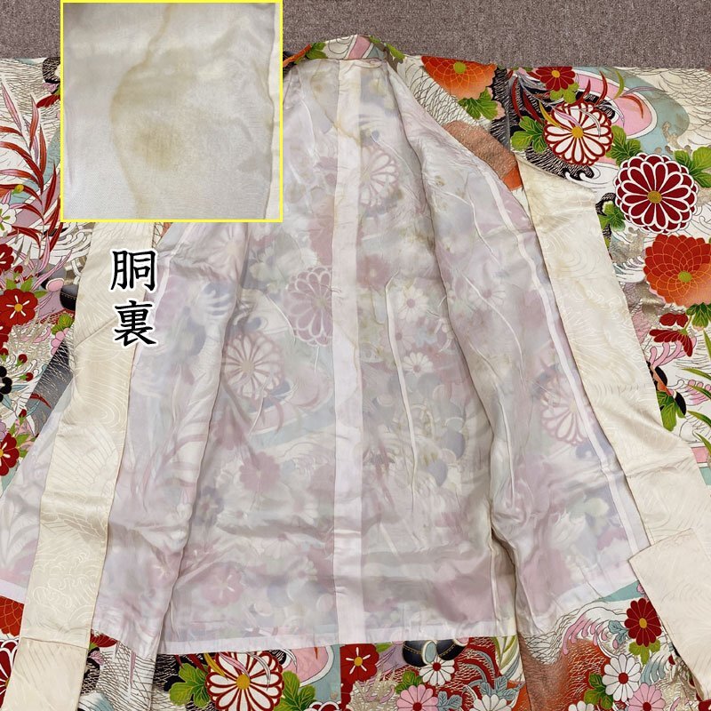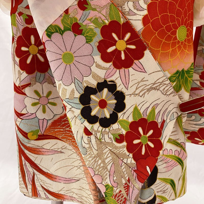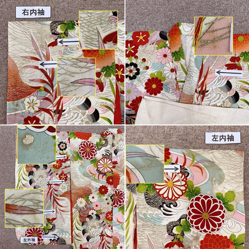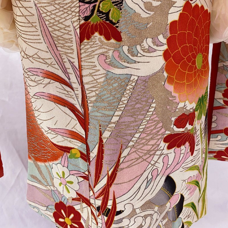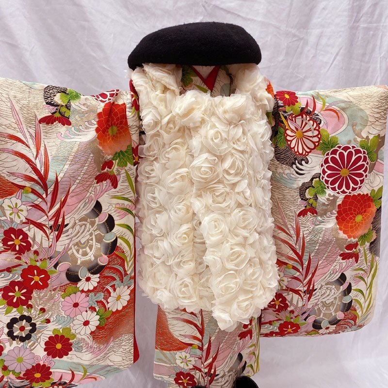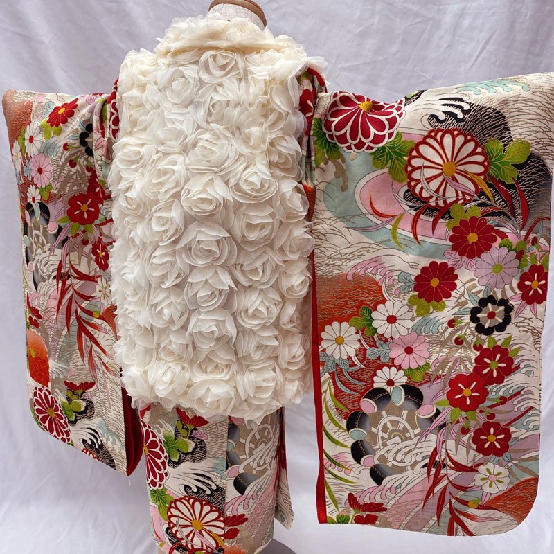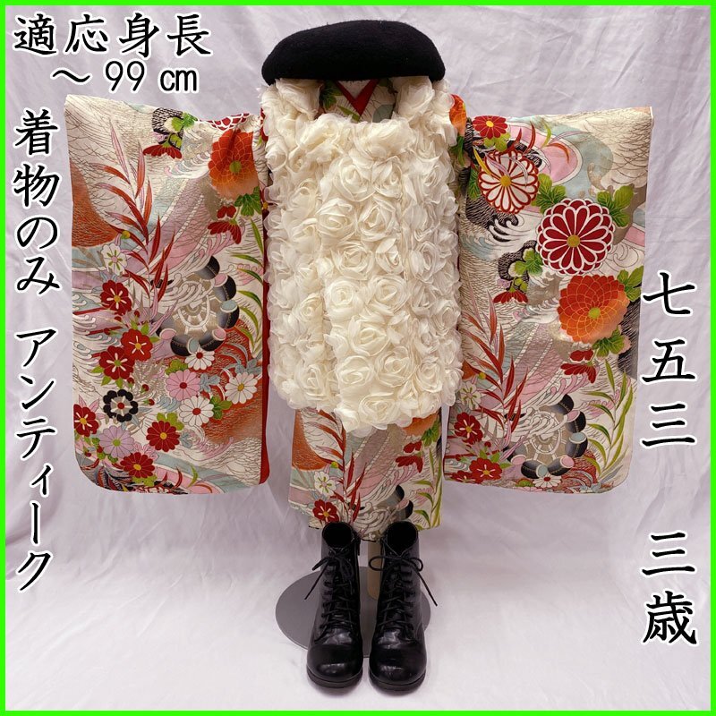 | ◎七五三 三歳 女の子 アンティーク着物のみ レトロ 金彩 白◎ (No.n) こちらの商品は着物のみです。その他のベレー帽、ハンドメイド被布、楽々衿、ブーツはセットに含まれません。 華やかな花文様が素敵な七五三3歳のアンティークのお着物です。金彩が施されております。 (着物)画像のようなシミが他にもございます。内側胴裏に薄いシミがございますが、内側なので見えません。アンティークの風合いとお考え下さい。肩上げをしておりませんので、お子様の裄丈に合わせてお直しをお願いします。 (長襦袢)こちらには長襦袢が付属いたしません。3歳の七五三で使用する場合は、長襦袢の代わりにお子様の負担が少なく便利な「子ども用楽々衿」をお勧めします。#ag楽々衿 【表地素材】(着物)正絹 【色】オフホワイト *モニターによって色味は実際と異なる場合がございます。 【サイズ】(着物) 裄:51cm、肩上げ幅:-cm、袖幅:28.6cm、袖丈:58.7cm、丈(肩から):94cm、腰上げ幅:-cm、前幅:19cm、後幅:22.8cm *素人採寸のため、多少の誤差はご容赦ください。 アンティーク着物で古い物ですので、それなりのシミや汚れ、ほつれなどダメージ等あるかと思います。現在出回っているアンティーク着物はシミやアクなどのダメージや手直しなど難がある事の方が多いです。多少の目立たないシミやアクに関しては記載をしておりませんので、ご了承ください。新品同様の綺麗さをご希望の方、少しのシミやアク、ほつれなどアンティークに御理解頂けない方のご購入はお控えいただきますよう、お願いします。 | |