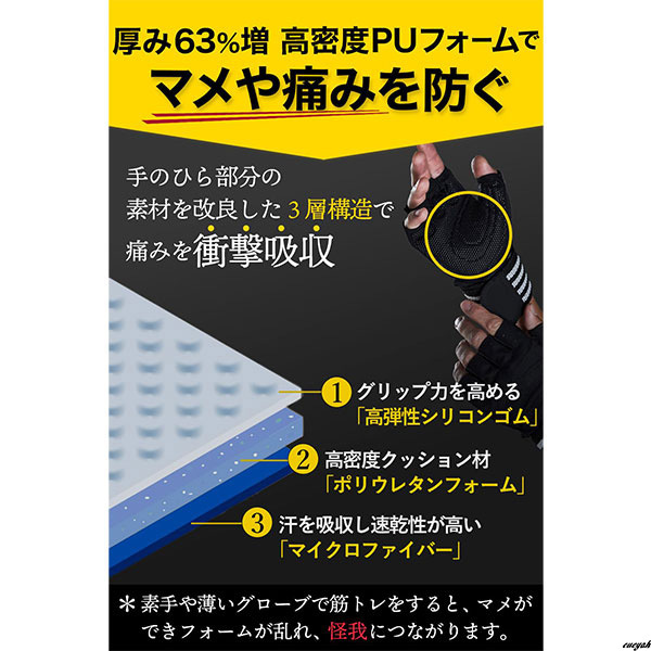 3層構造が手のひらにかかる負荷を吸収し、マメを防止。