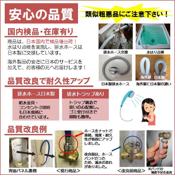 さらに建物床面の耐荷重、重量などを気にせずに設置できます。排水ホースは検品時、安心の日本製に交換しています。