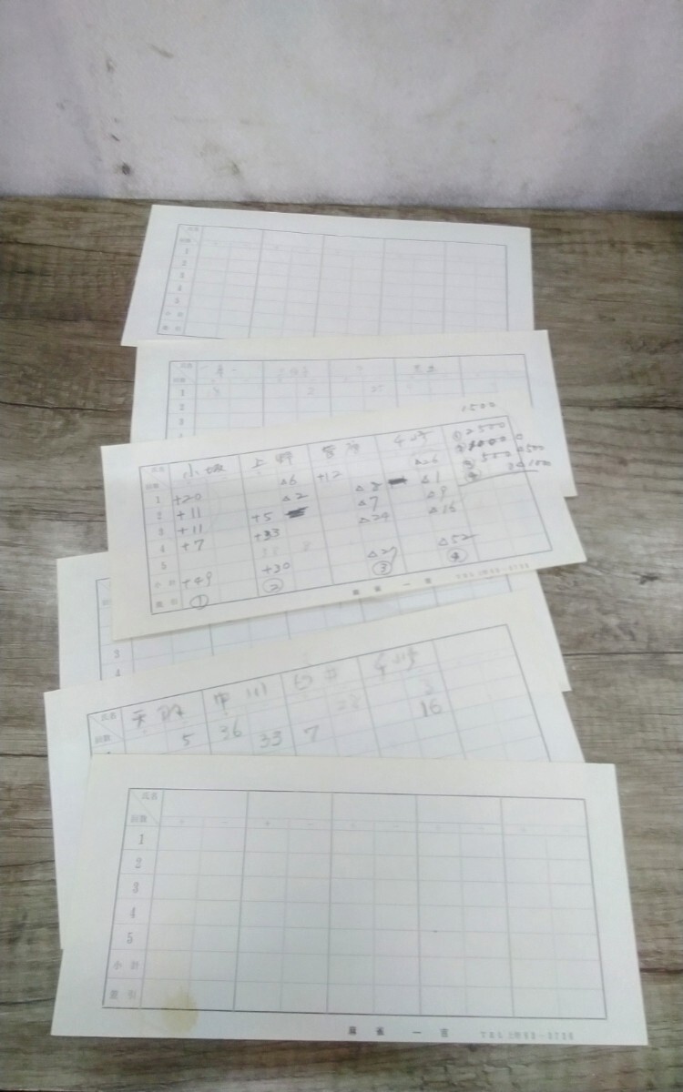 得点表、書き込み用紙他あります(写真図6〜7参照)得点棒が不足があります。