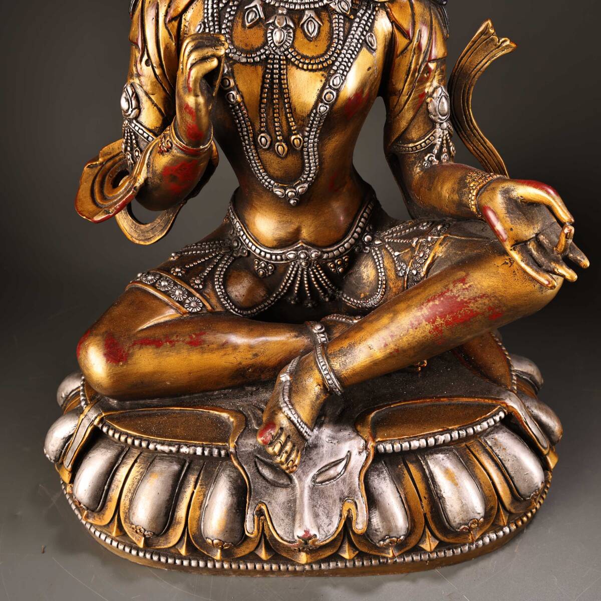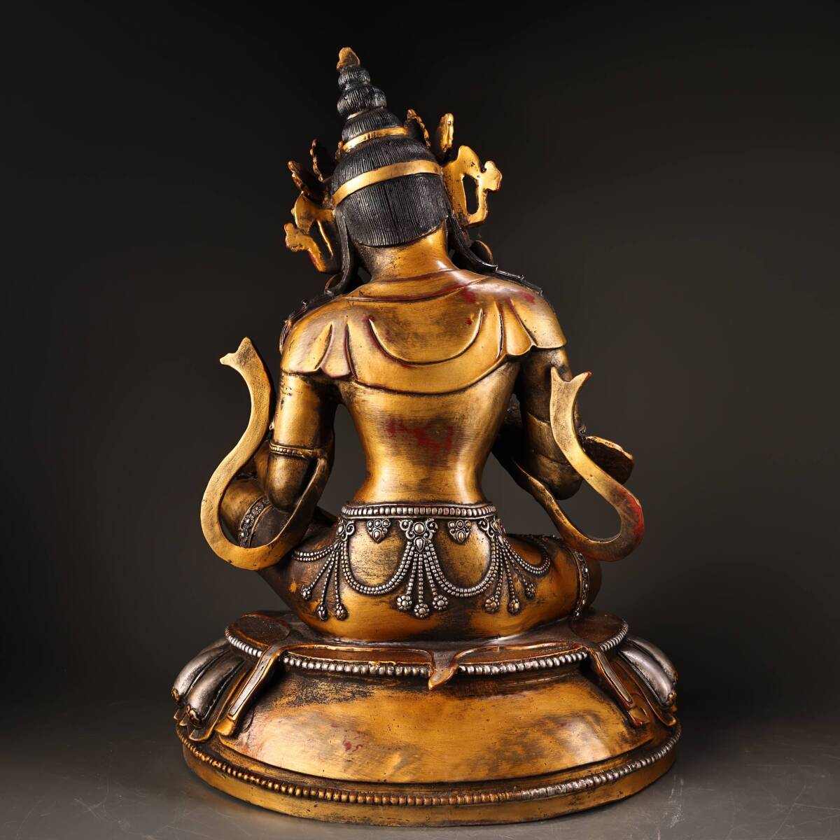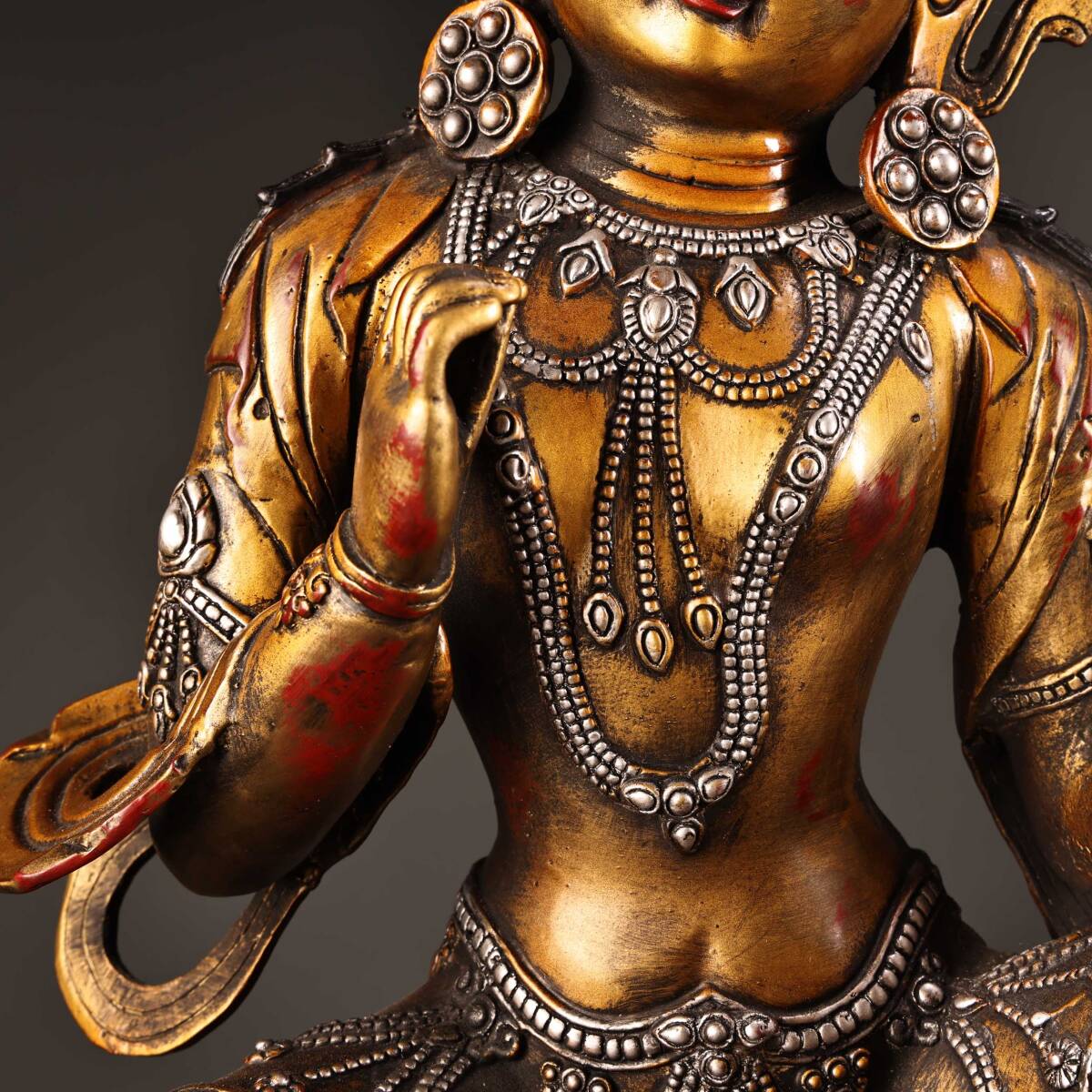*珍品旧蔵* 清 純銅 全銅 高浮彫鏨刻描金銀 綠度母 仏像 奉納されていた 供養品 銅製品 銅器 極細工 中国古玩 骨董品 古美味 H49