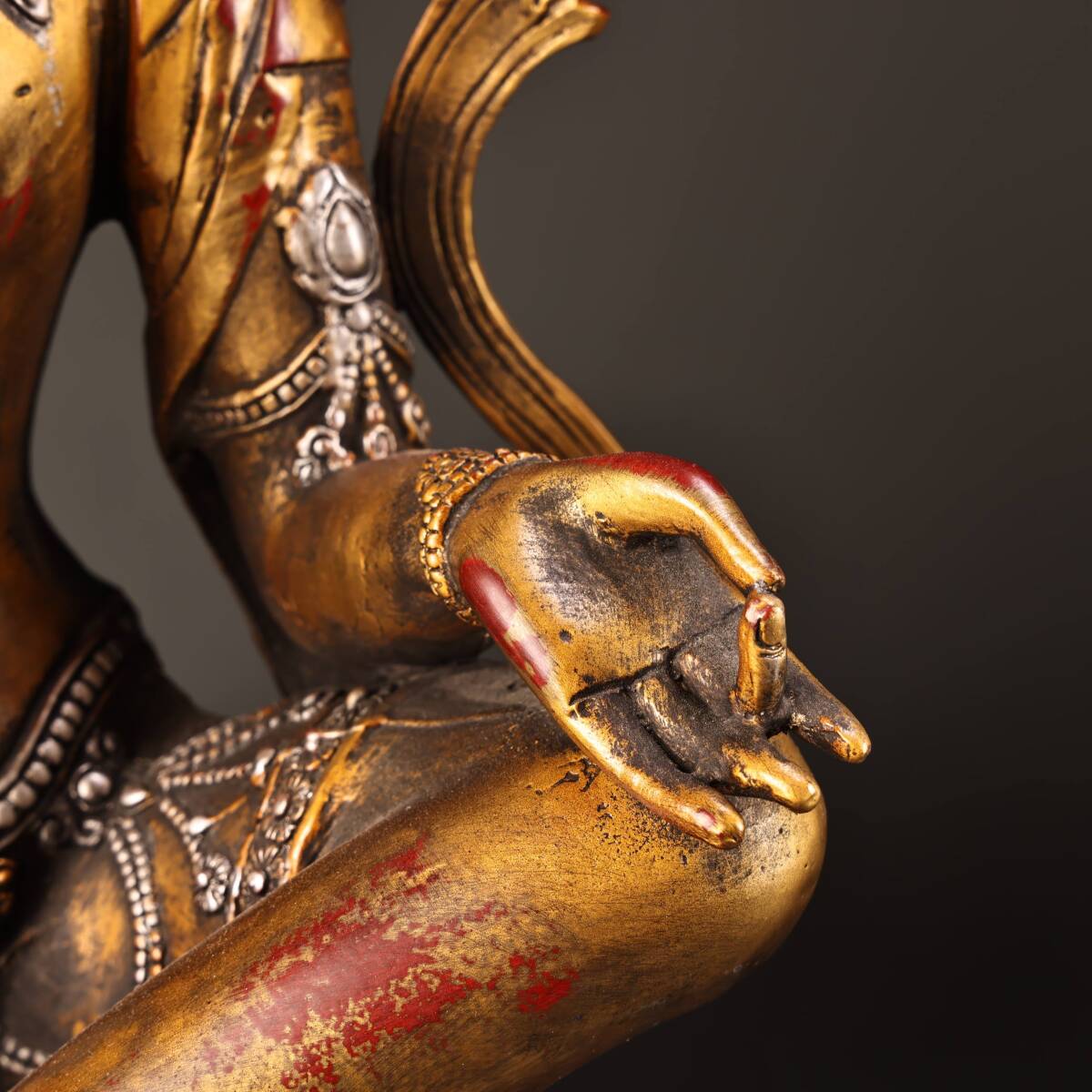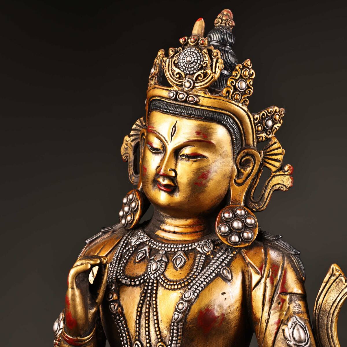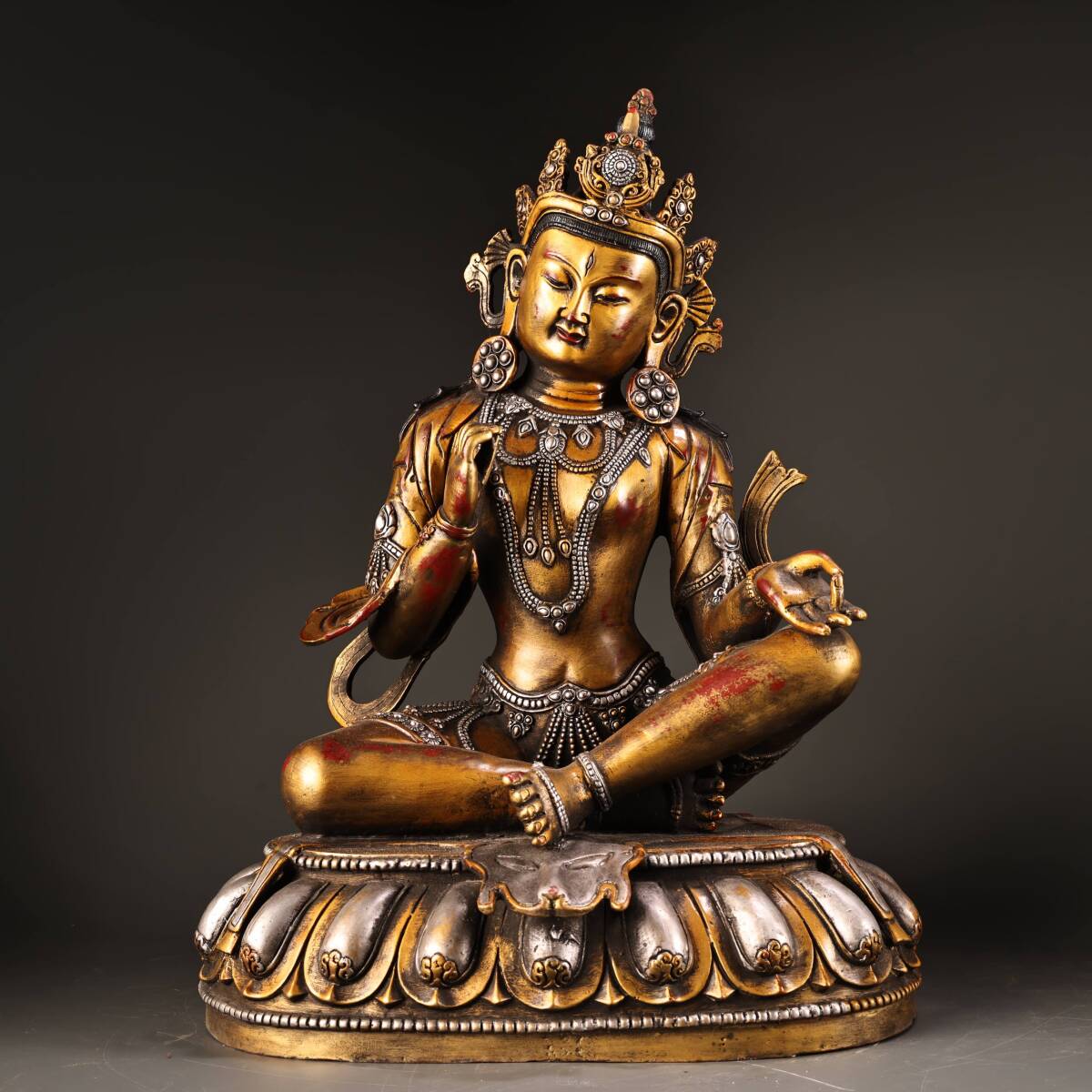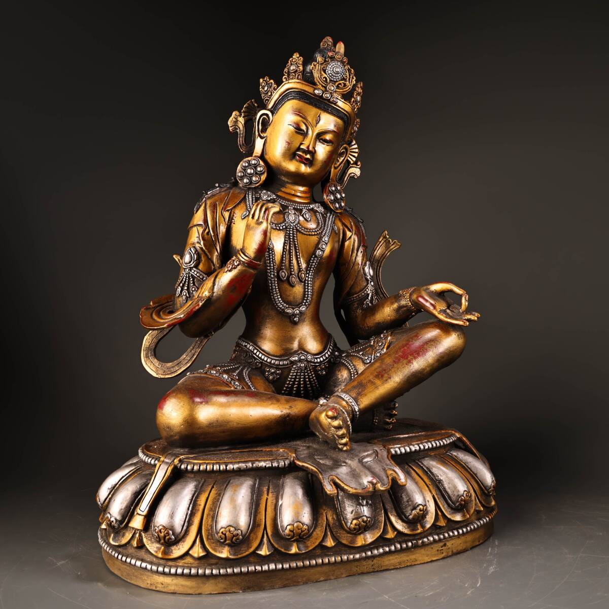 *珍品旧蔵* 清 純銅 全銅 高浮彫鏨刻描金銀 綠度母 仏像 奉納されていた 供養品 銅製品 銅器 極細工 中国古玩 骨董品 古美味 H49
