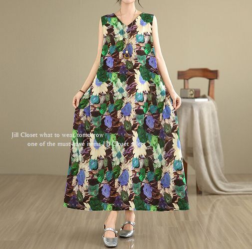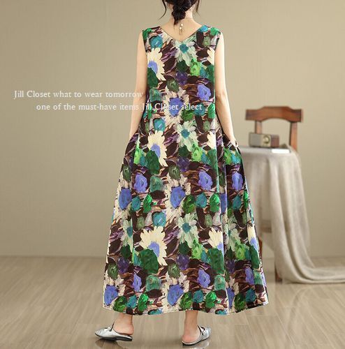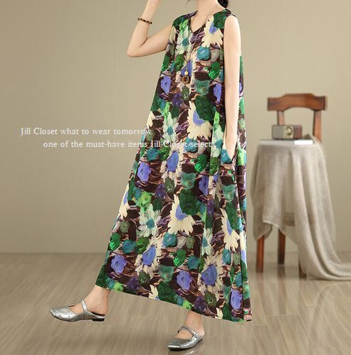 新品【送料185円】ロングシーズン対応◎カーデのインナーにも最適♪水彩風 美色FLOUR*Vネック*ノースリーブ ロングワンピース6619.GREEN