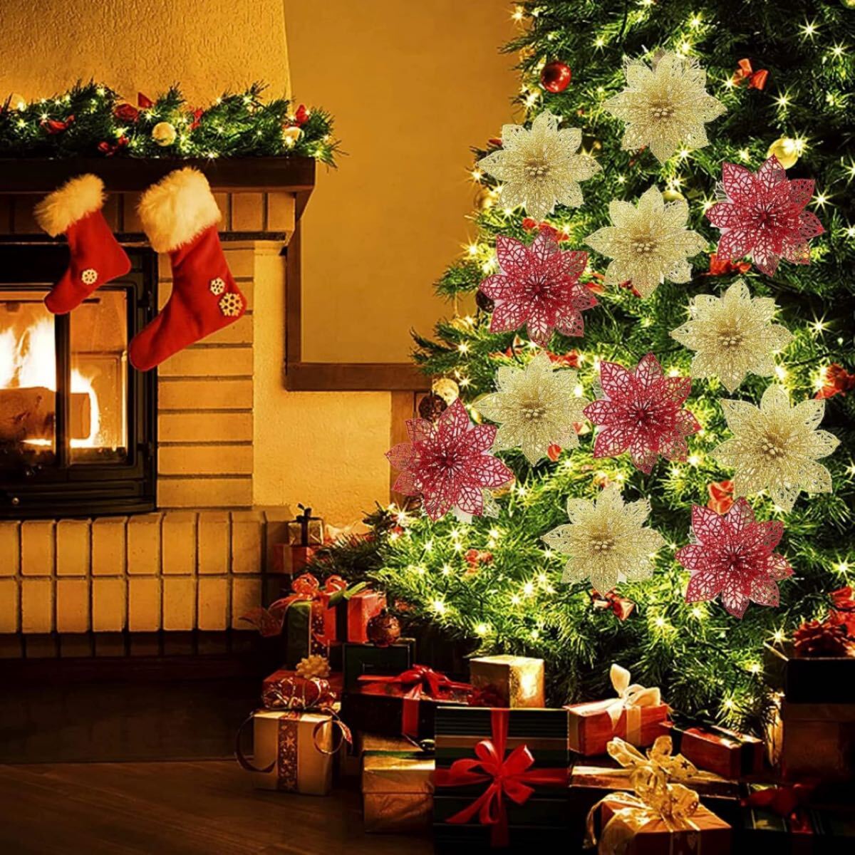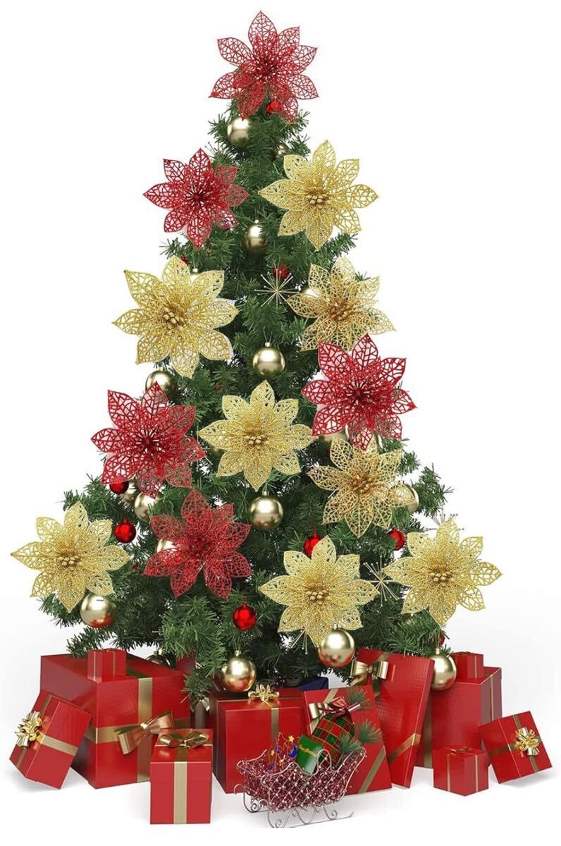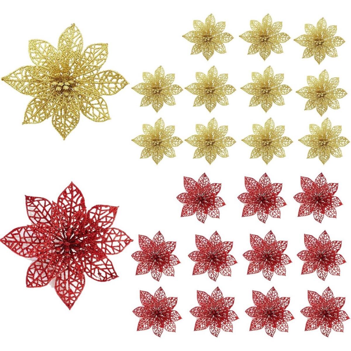 クリスマスツリー飾り 人工花 造花 クリスマス花 フラワー オーナメント 玄関 屋内 お店 デコレーション キラキラ 飾り パーティー 結婚式 お祭り ギフト 装飾 プラスチック DIY 花輪 影用品 金色 24個(ゴールド&赤)