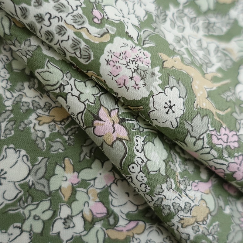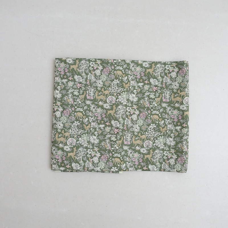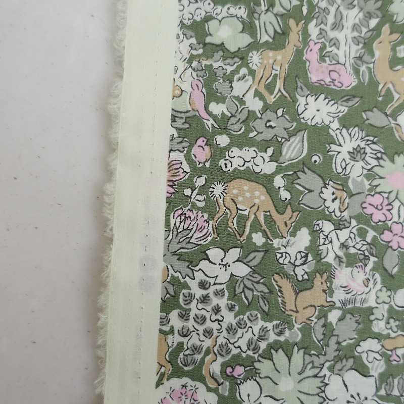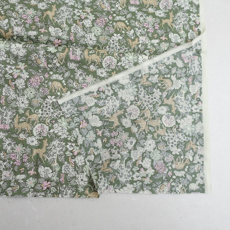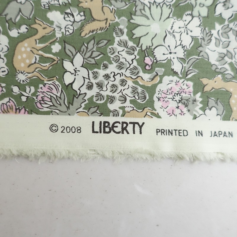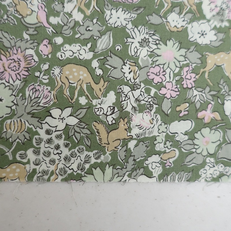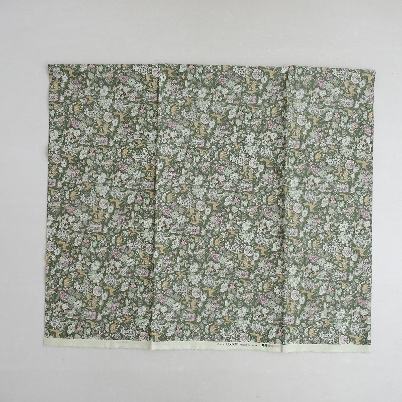 | LIBERTYのFergus タナローン生地 111x256cmです。 カラーはグリーンカーキベースにピンク・ベージュなどで「Fergus」のテキスタイルプリントが施されています。 コットン100%のタナローン生地です。 |