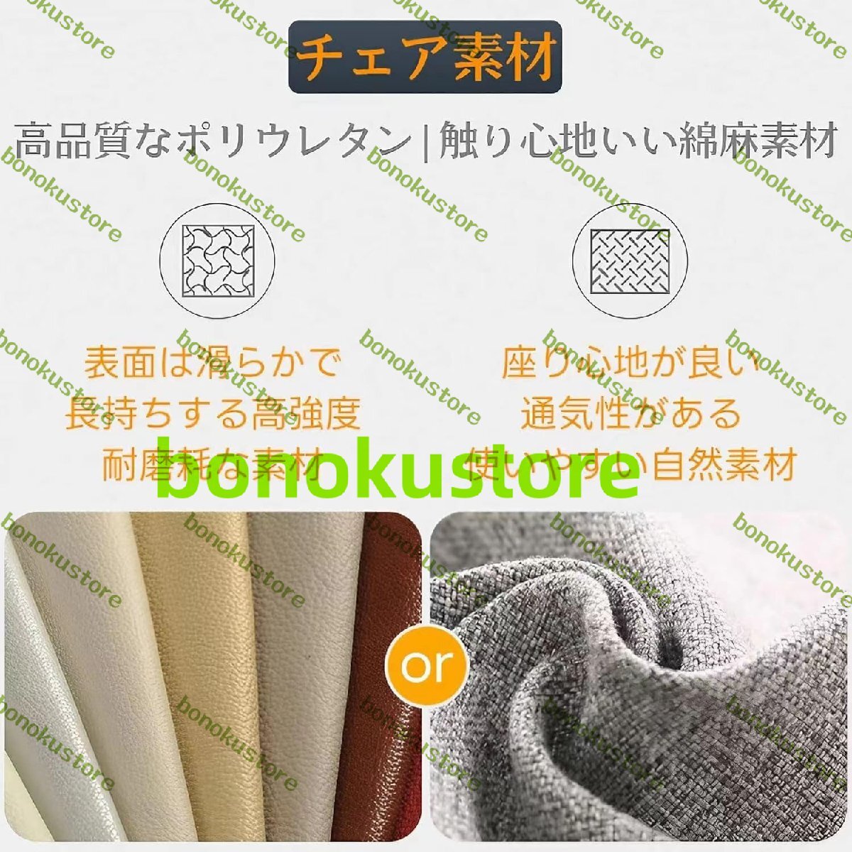 座面素材:椅子の座面は高品質な耐摩耗性のレザーで作られており、水防止で、簡単にきれいにできます。内部は高密度スポンジ、ソフトで快適、そして強力な回復力がいっぱい。通気性がよく、使いやすい綿麻素材の座面もあります。お好きに合わせて、革と綿麻素材のイスを自由に選択できます。