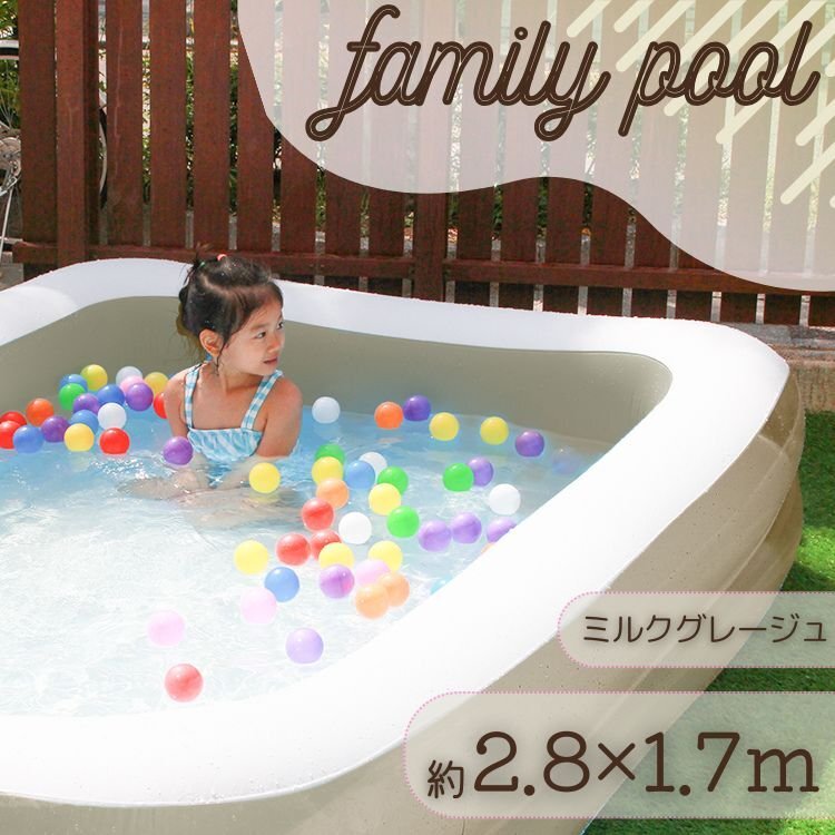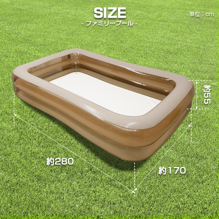 家族みんなで入れる!!ビッグサイズの家庭用プール♪ お友達をたくさん呼んだり、家族みんなで遊んでも楽しめます♪ お庭やバルコニーで遊んで暑い夏を乗り切ろう!! 2気室仕様で空気が入れやすい。さらに、遊び終わっても水抜きが簡単!! 【商品仕様】 カラー:ミルクグレージュ サイズ(約):280cm×170cm×55cm 容量 (約):730L 材質 PVC(ポリ塩化ビニール) 気質 2気室 対象年齢:4歳以上 【注意事項】 ・エアポンプは付属していません。 ・本商品はPVCを使用しております。材質の特性上、接触・摩擦による他製品への色移り、 または本商品への色移りすることがありますのでご注意ください。 ・必ず保護者同伴のもと、本商品をご利用下さい。 |