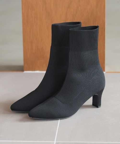 参考商品名:ポインテッドトゥプレートヒールニットショートブーツ