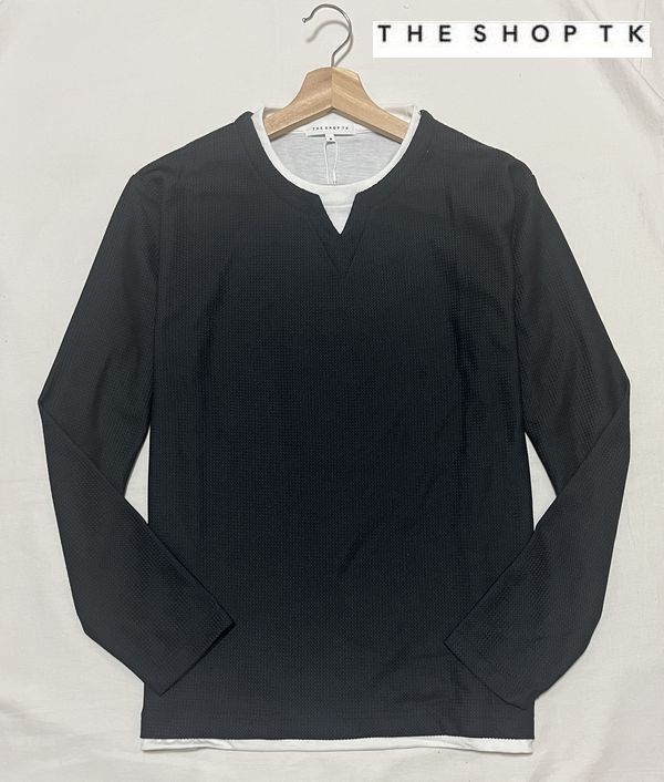 ◆B12 新品 タケオキクチ THE SHOP TK バスケット編みキーネックフェイクレイヤー黒ド 長袖カットソー 【 M 】 黒系 重ね着 長袖Tシャツ