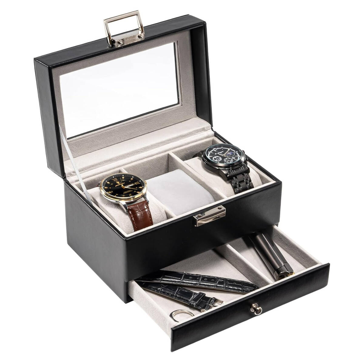 腕時計ケース 3本用 2段式 ブラック PUレザー ウオッチボックス アクセサリー収納 ガラス天板 ディスプレイケース 小物 プレゼント