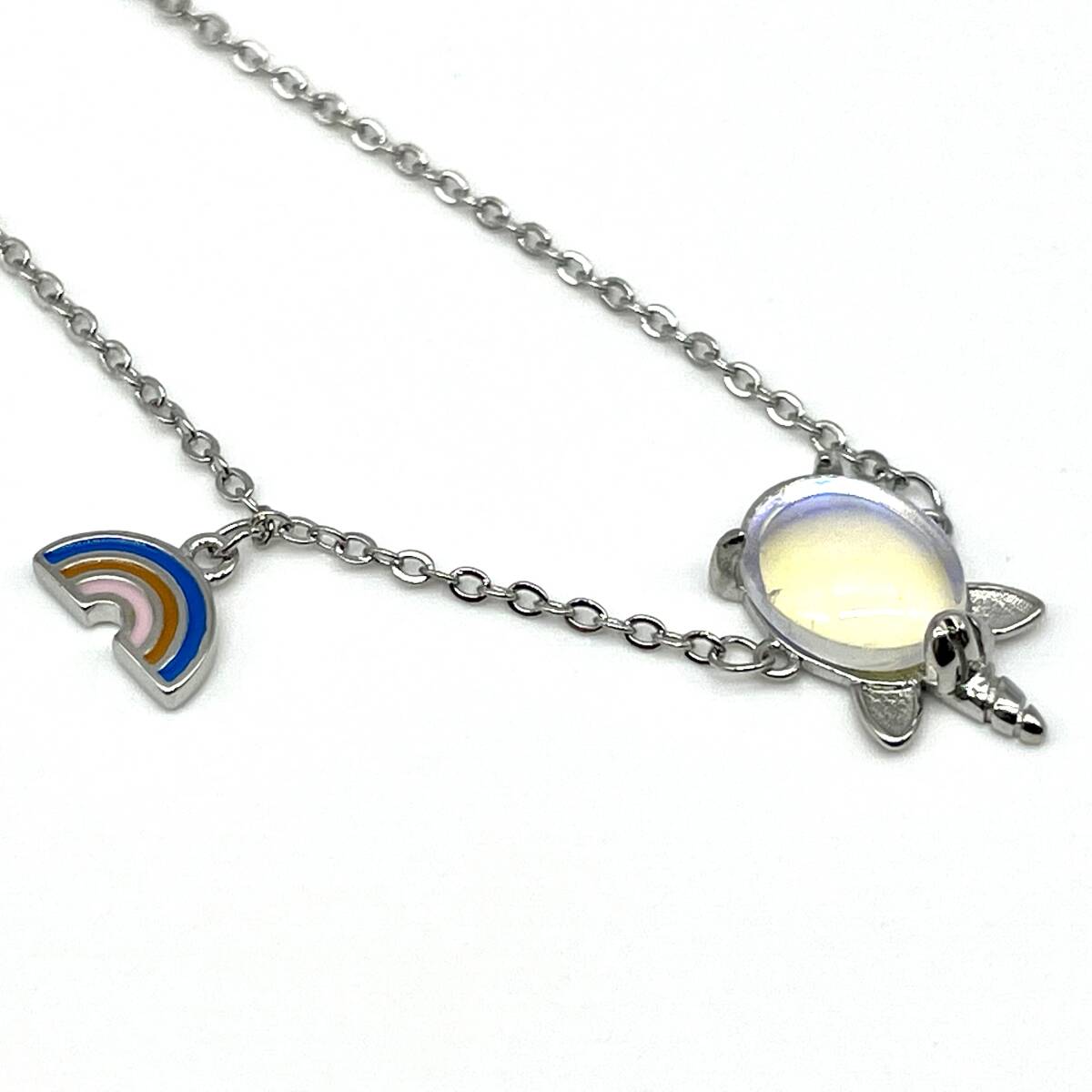 存在感のあるクリアストーンのユニコーンチャームにレインボーデザインのシルバーチャームを配しバランスの良い仕上がり。