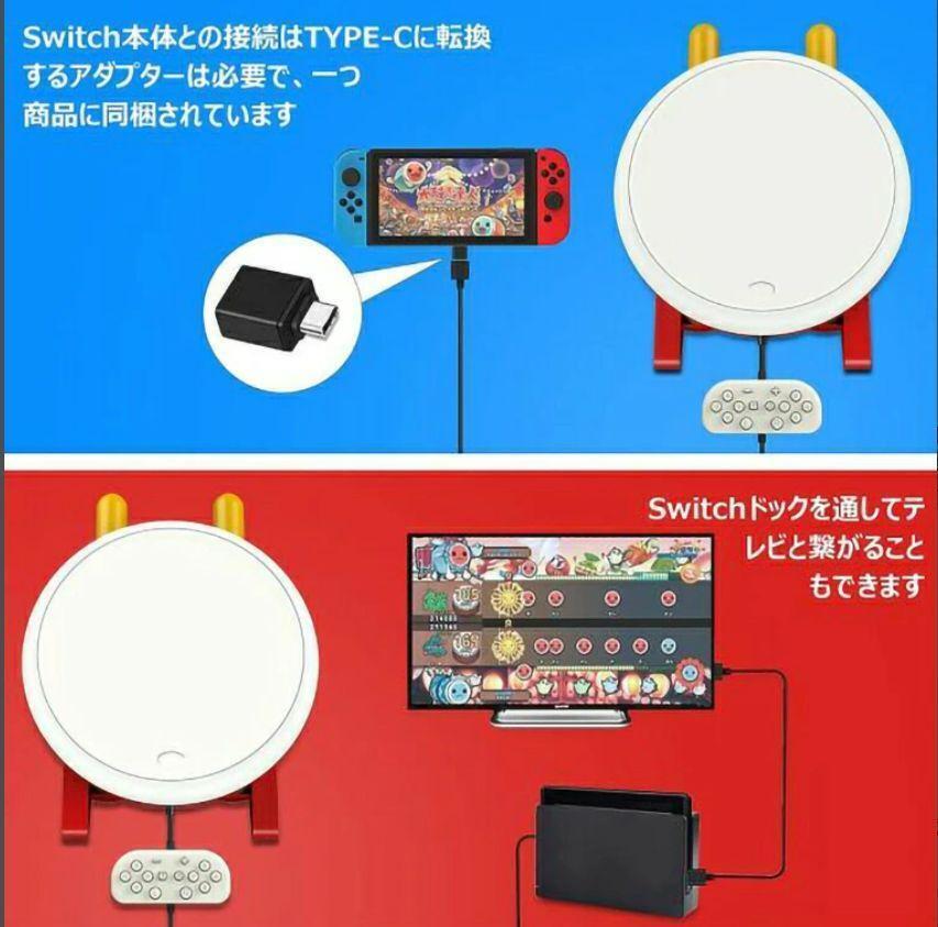 太鼓の達人にNintendo Switch本体やNintendo Switchドックを通してテレビと接続の2つの使い方があります。Switch太鼓本体と直に接続するため、Type-C転換アダプターは1つ同梱されます。