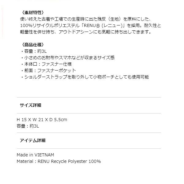 使い終えた古着や工場での生産時に出た残反(生地)を原料にした、100%リサイクルポリエステル「RENU (レニュー)」を採用。