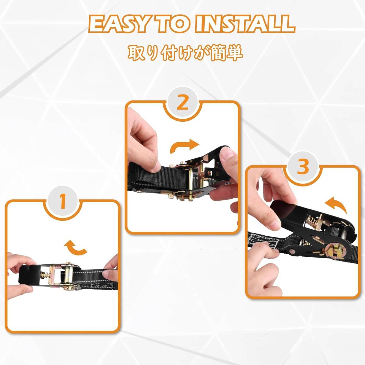 • 【ラチェット機能】荷締めベルトはラチェット機能付を搭載し、荷物をしっかり締め付けます。引き出すだけで長さを調節可能で、荷締め作業がスムーズかつ簡単です