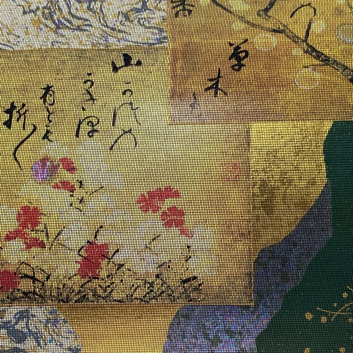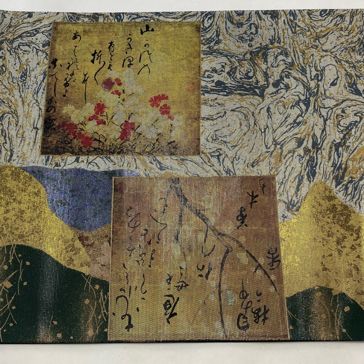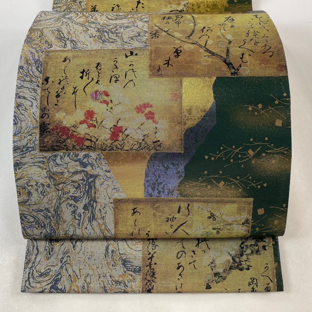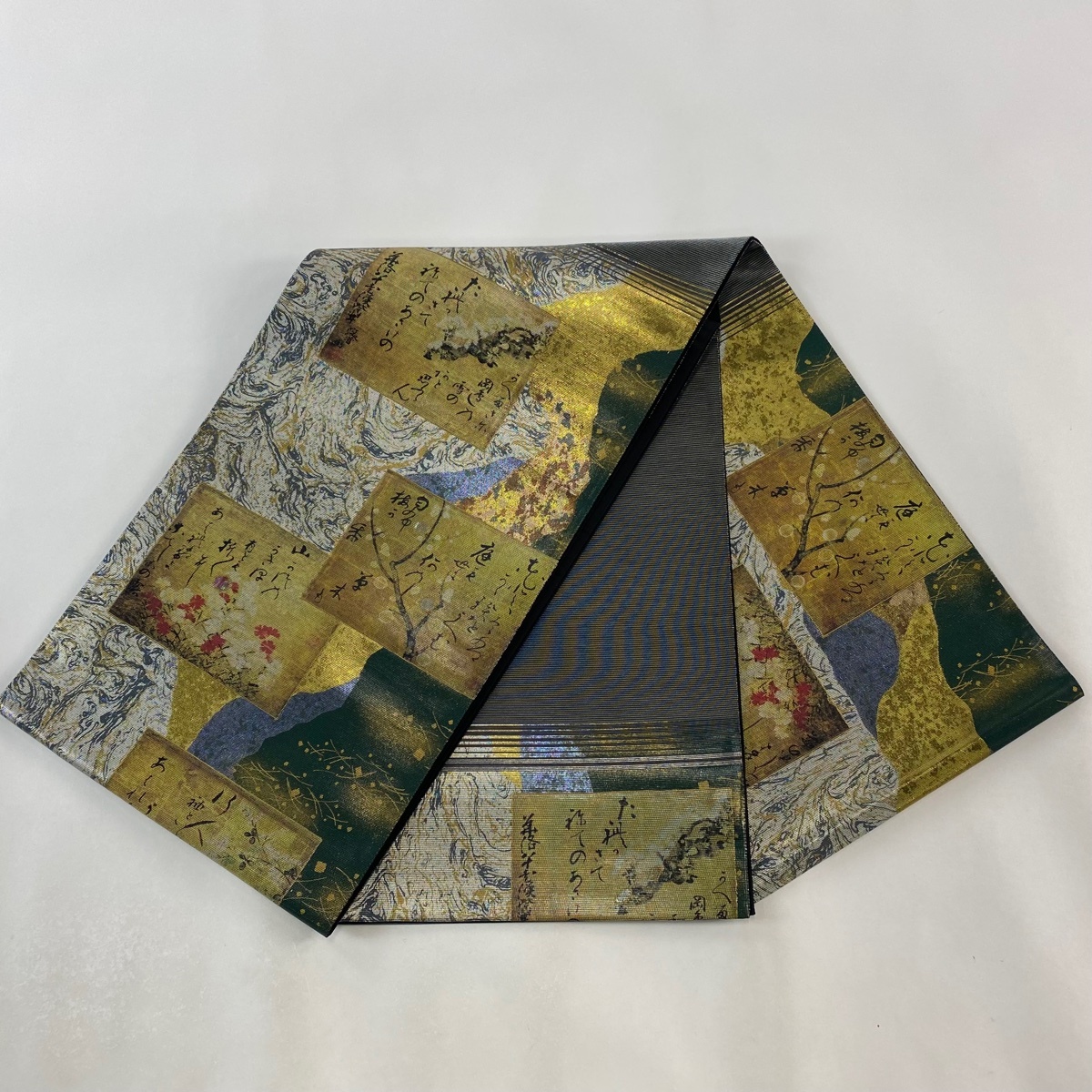 | 袋帯 美品 秀品 色紙 文字文 箔 螺鈿箔 銀色 お太鼓柄 正絹 【中古】 |