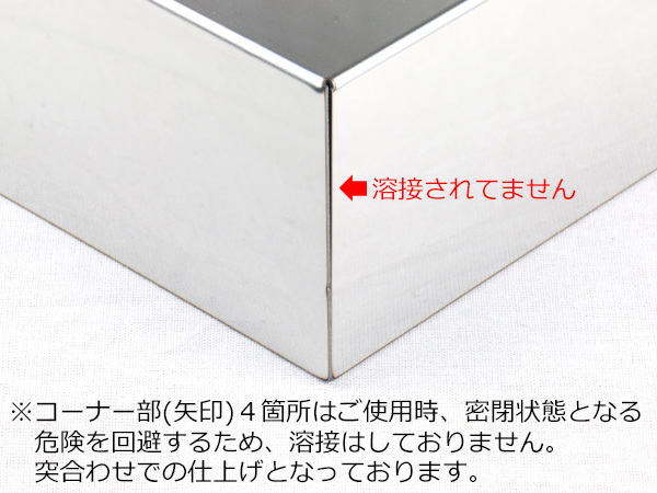 コーナー部はわずかな蒸気を逃がし、フタが鉄板に密着するのを避ける為、溶接をしておりません。