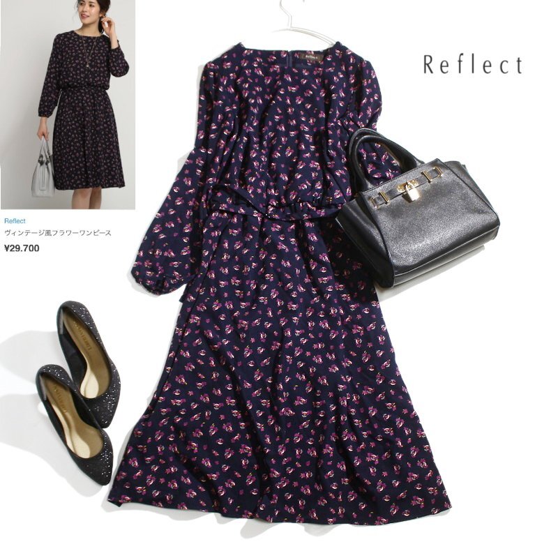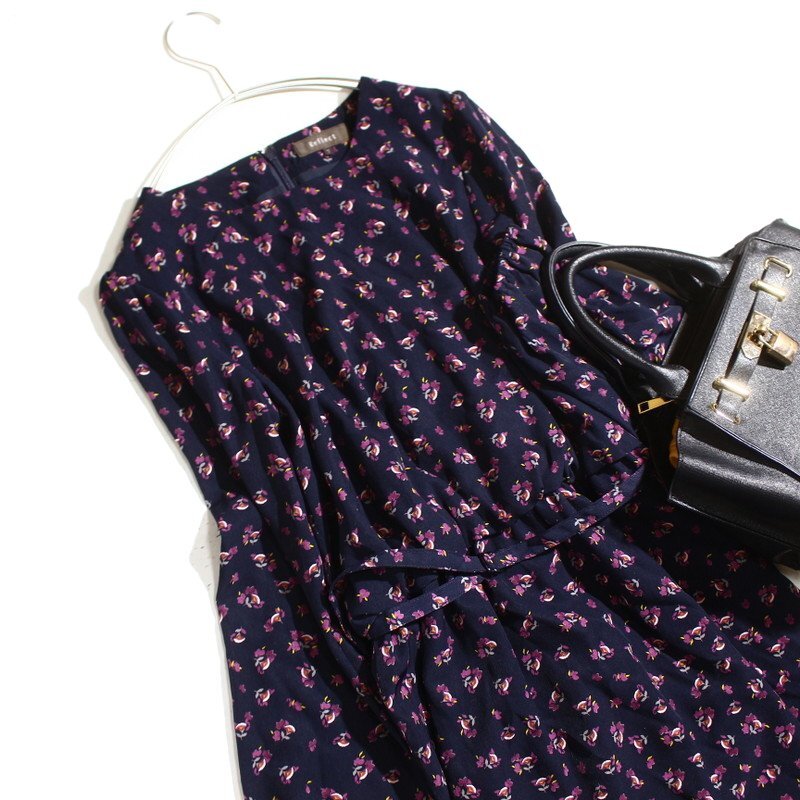 美品 リフレクト Reflect 株) ワールド 秋 冬 春 ベルト付き フラワー プリント 長袖 ロングワンピース 7号 ネイビー 紺 パープル 紫 清楚