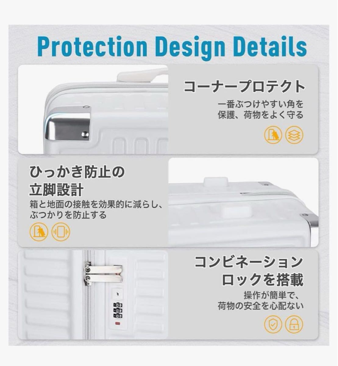【全面的に荷物を保護-Protection Design Details】キャリーバッグの保護性能の向上にも多くの工夫が凝らされています。角は衝撃を受けやすいので、アルミ製のコーナーパットがスーツケースとお荷物を衝撃から保護します。ひっかき防止の立脚も箱と地面の接触を効果的に減らし、ぶつかりを防止します。