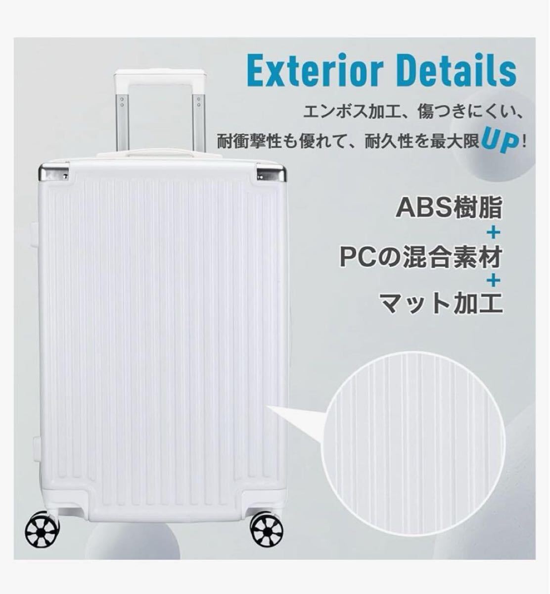 【高品質とファッションの両立-Exterior details】ABS樹脂とPCの混合素材で作られたこのキャリーケースは、純ABS樹脂より耐衝撃性が優れています。エンボス加工により、キャリーケースのボディが傷つきにくくなり、マット加工も加えて、ぶつかると傷ついでも、目立たないです。キャリーバッグ自体の耐久性を保証しながら、ファッションな外観も兼ね備えています。