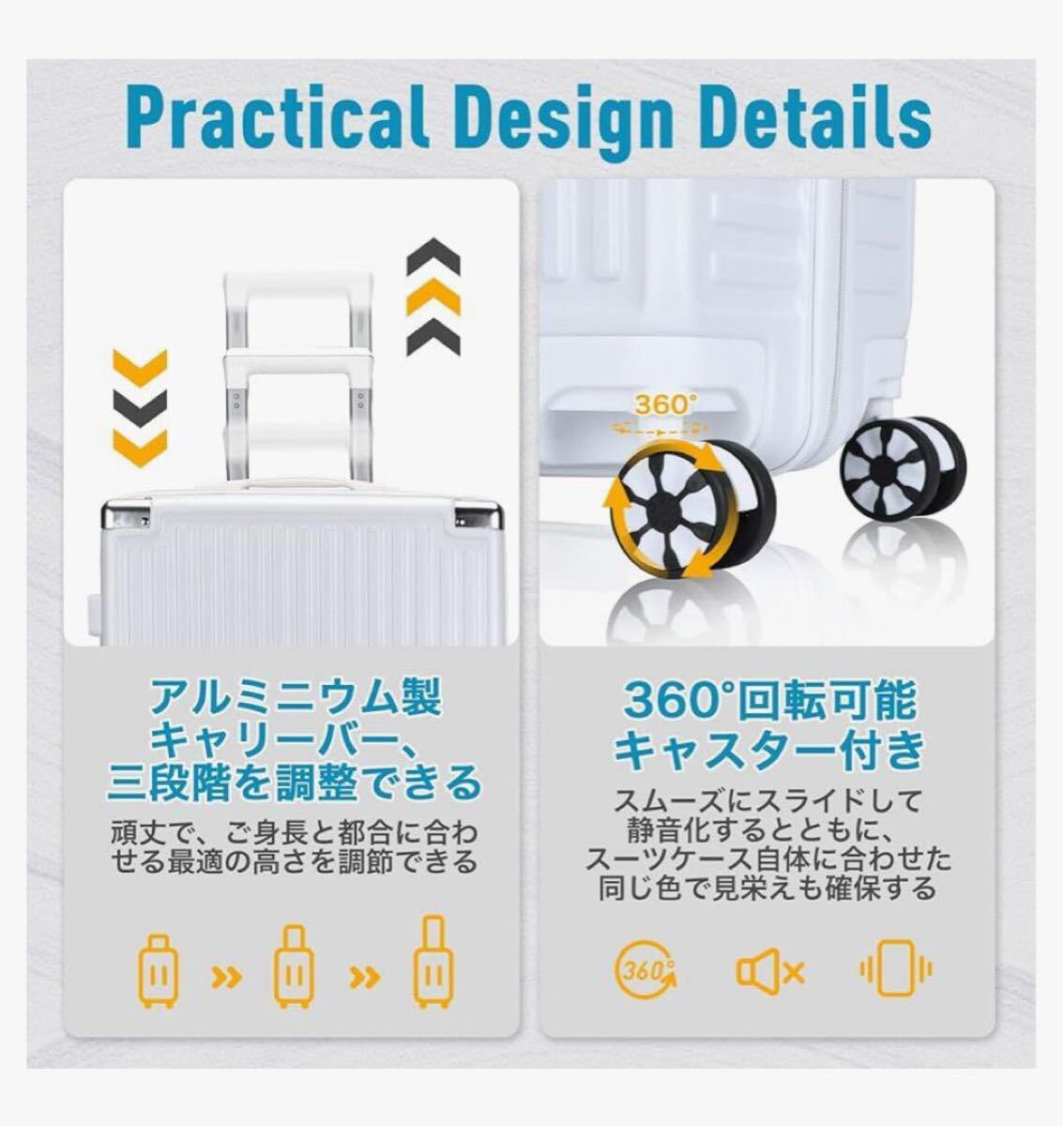 【使いやすさの追求-Practical Design Details】アルミ製のキャリーバーが頑丈で、ボタンワンブッシュでご身長と利用シーンに合わせて三段階調節が可能です。360度回転、自由自在に方向転換が出来る四輪付き、スムーズな動き、耐摩耗性を向上させます。