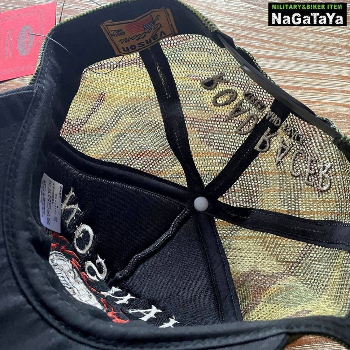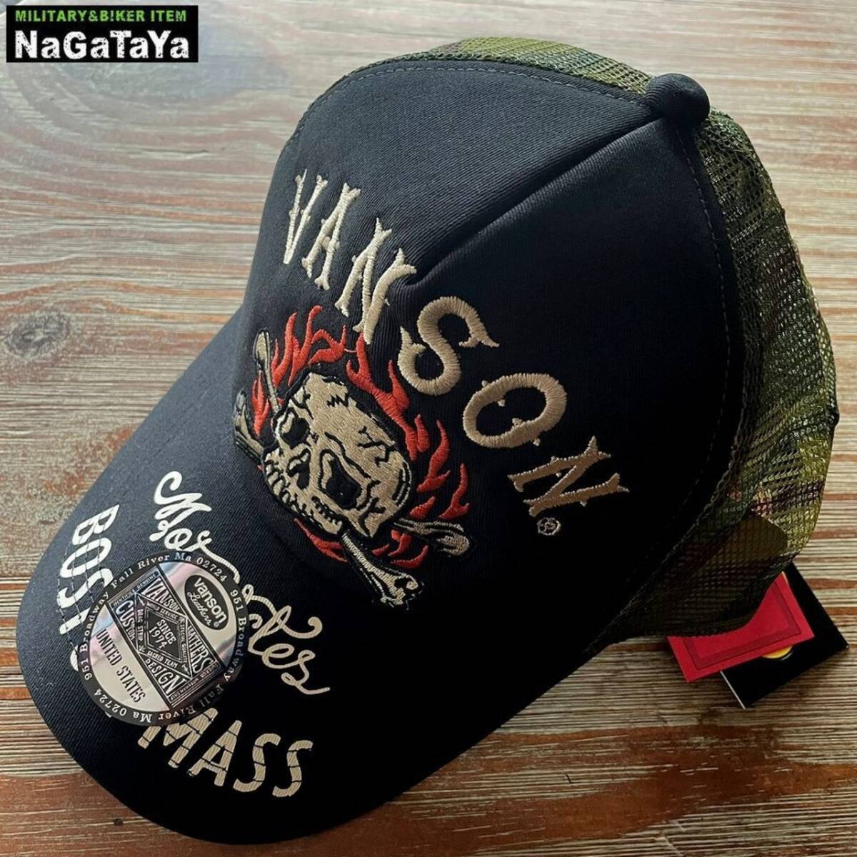 VANSON バンソン スカルファイヤーロゴ刺繍 メッシュキャップ ブラック×カムフラ ツイル生地 帽子 メンズ NVCP-2511