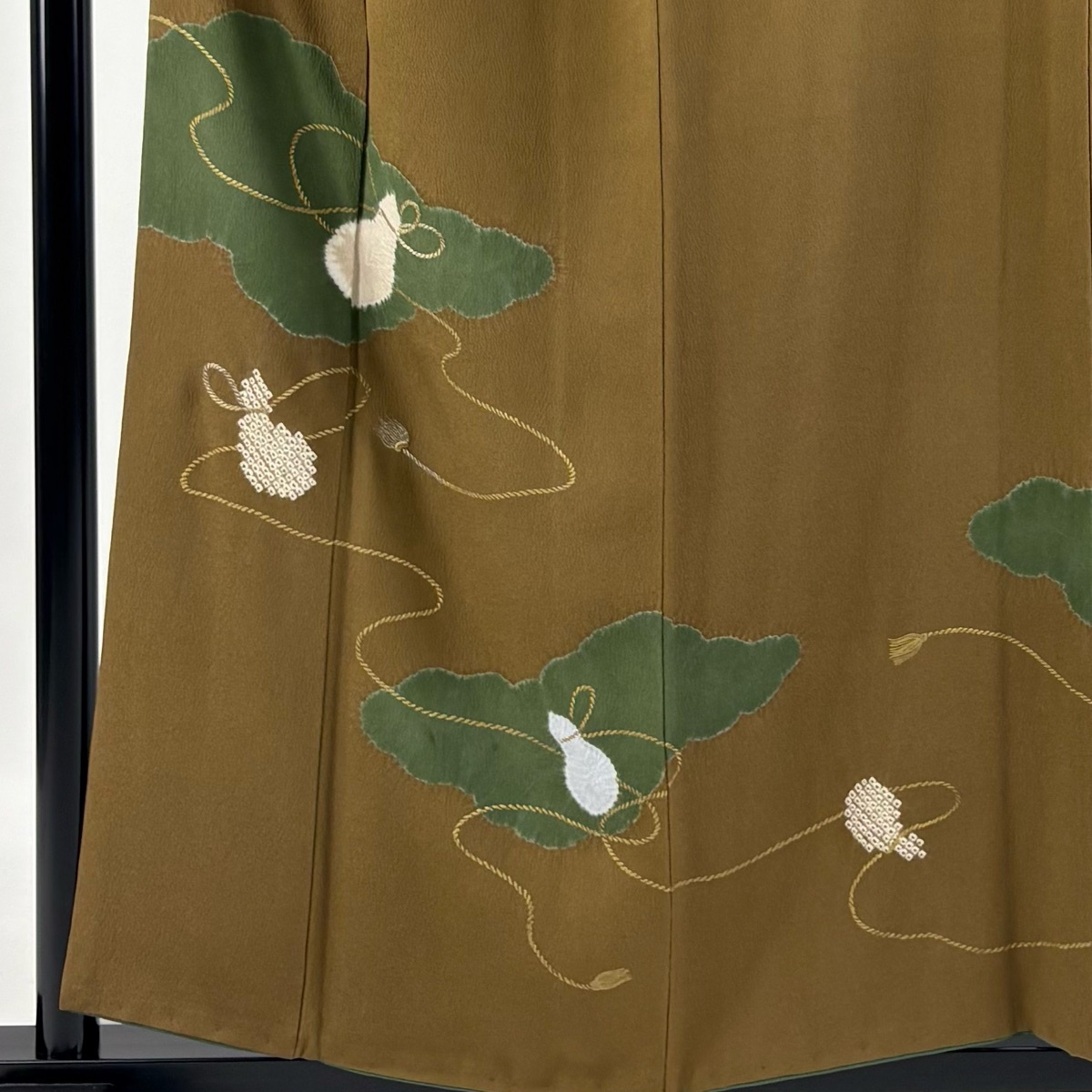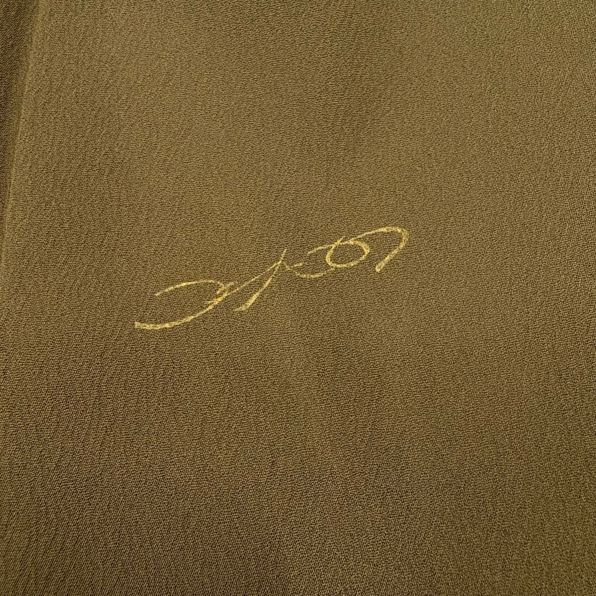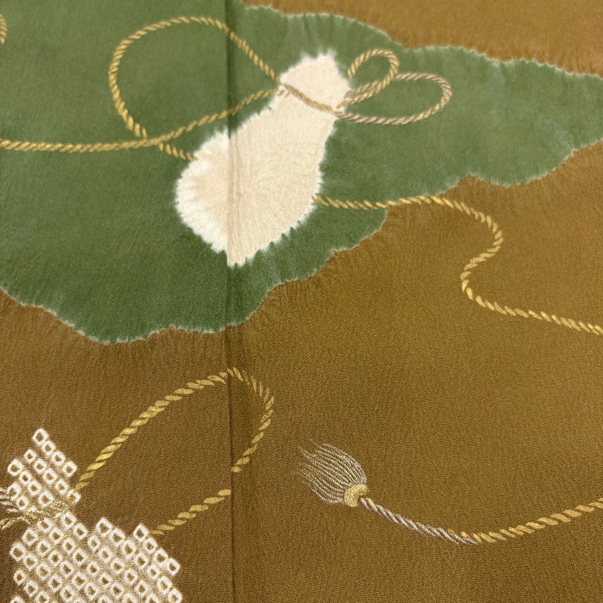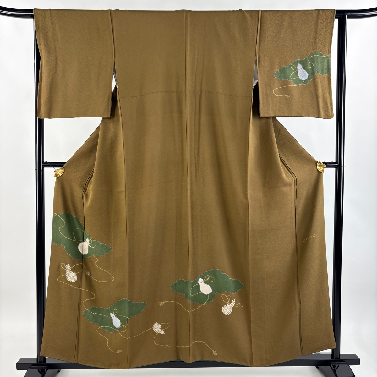 | 付下げ 秀品 落款 コシノヒロコ 瓢箪 雲文 絞り 金糸 茶色 袷 身丈157 裄丈65 M 正絹 【中古】 |