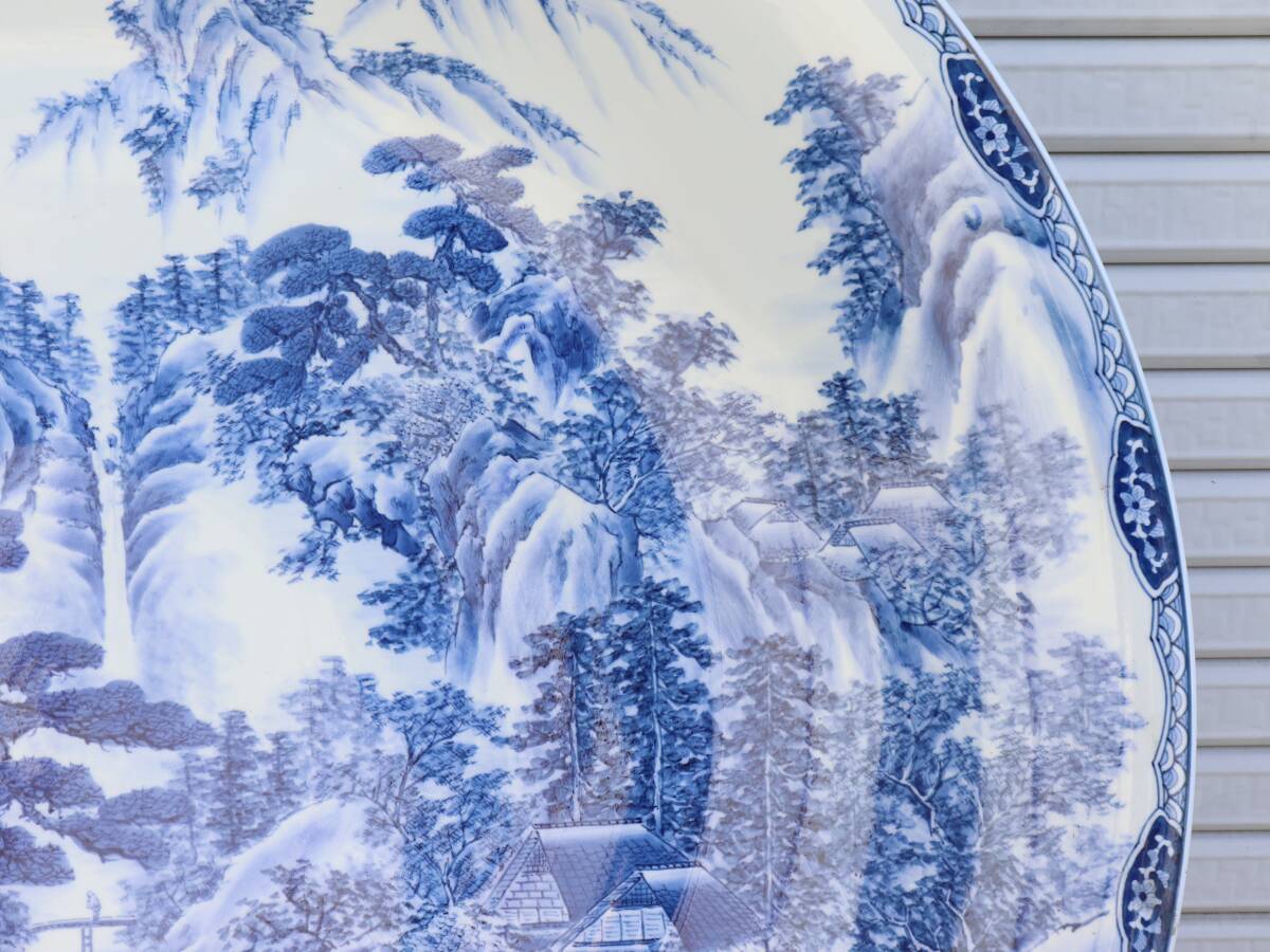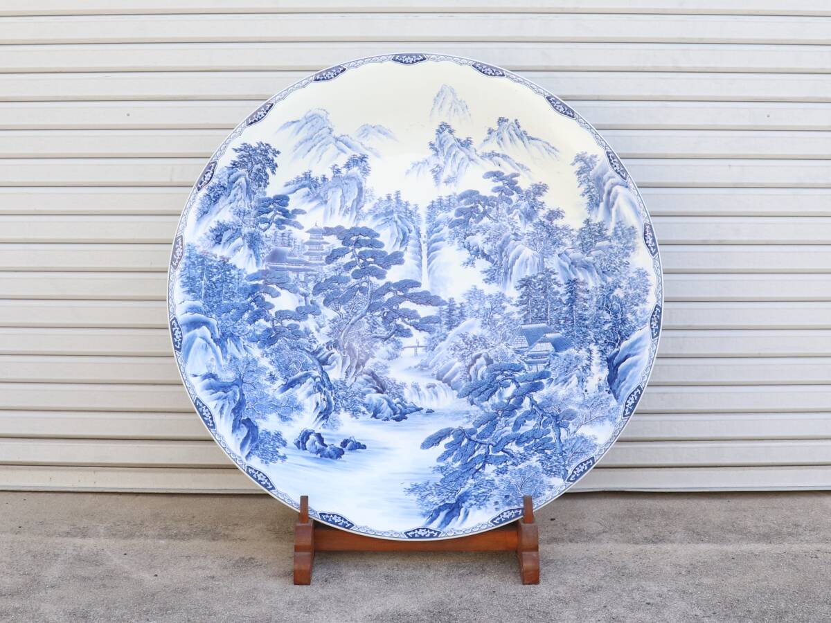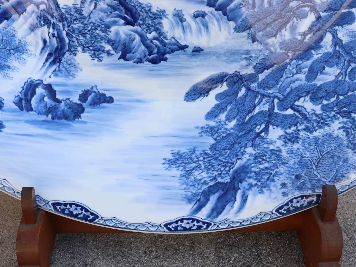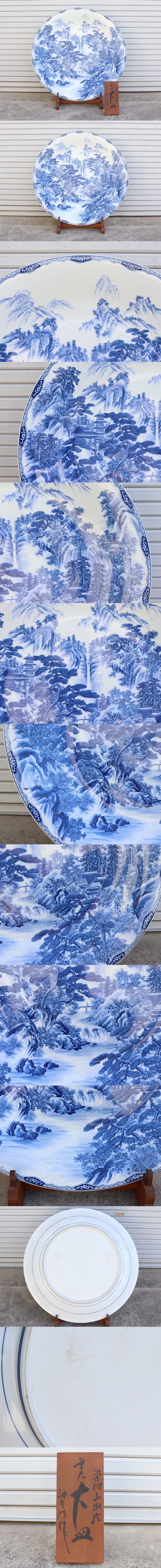 | ■有田焼■特大!!98㌢ 神右衛門 作 染付 山水図 大皿 伝統工芸 立札 皿立付 f2005A | ||||||||||||||||||||
