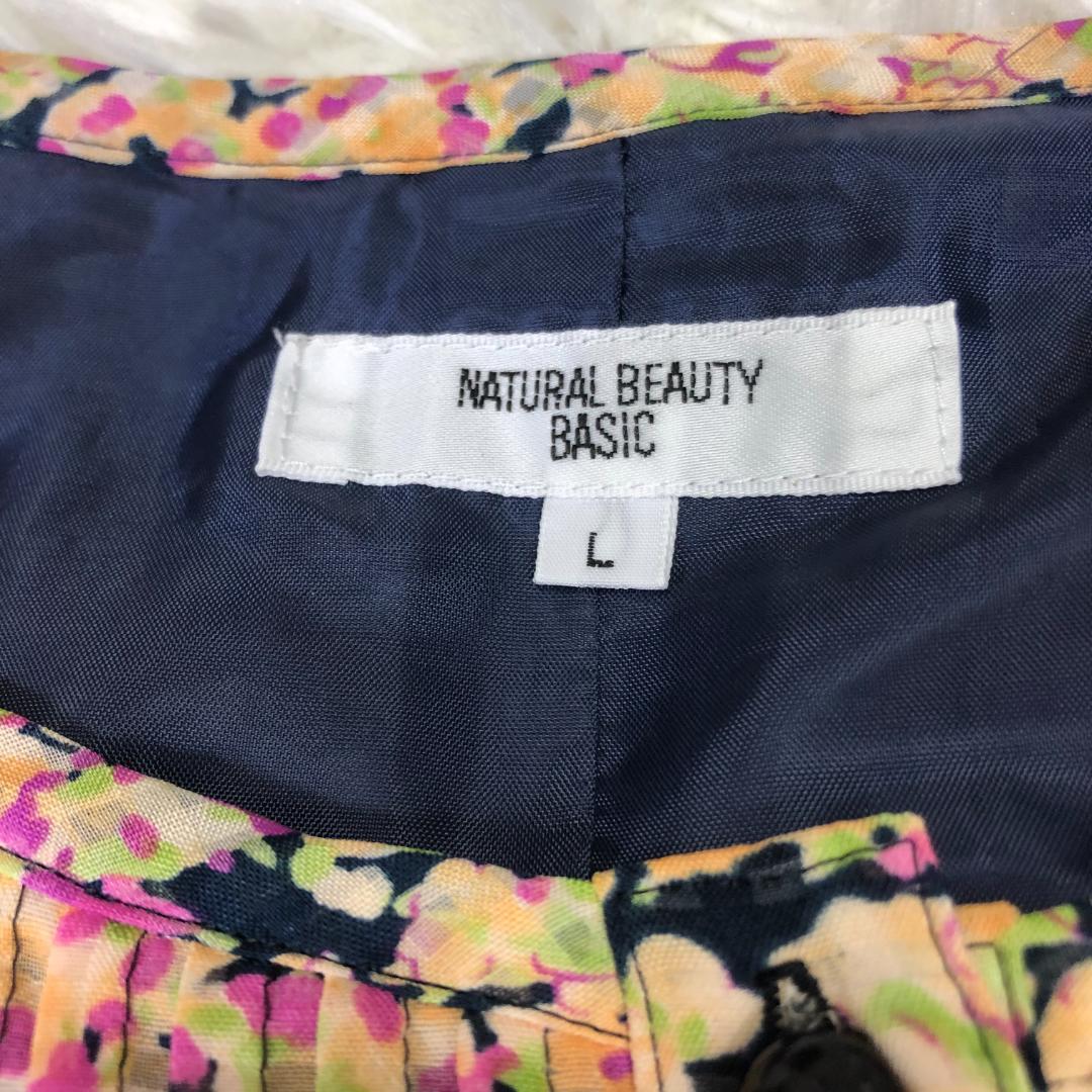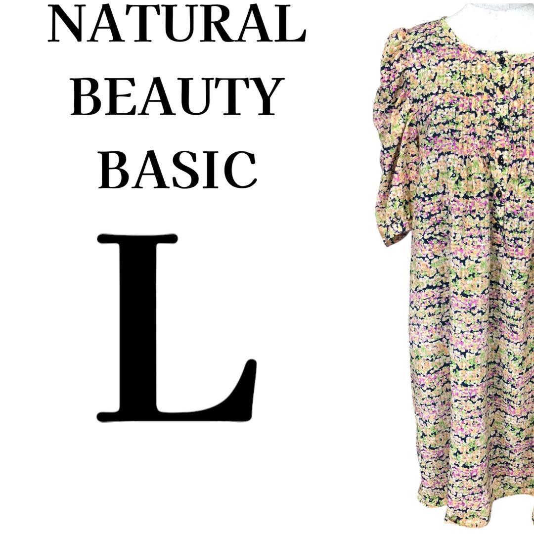 【美品】ナチュラルビューティーベーシック 半袖 膝丈 花柄ワンピース L