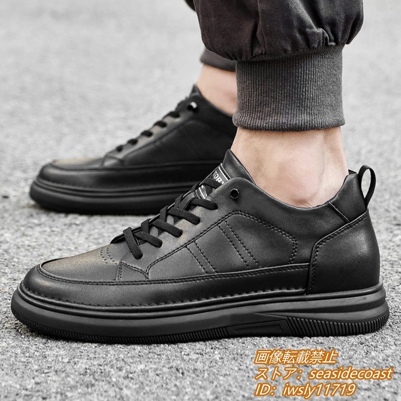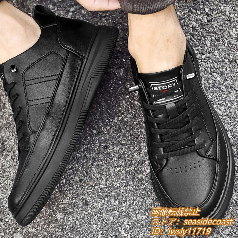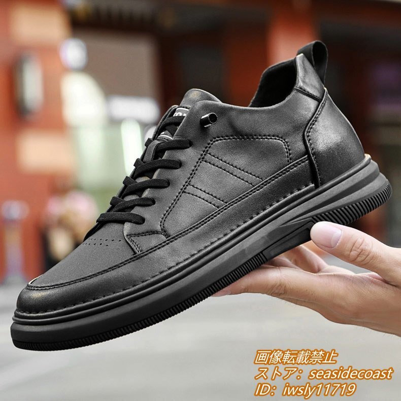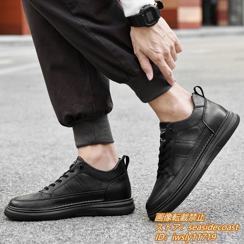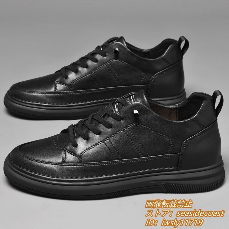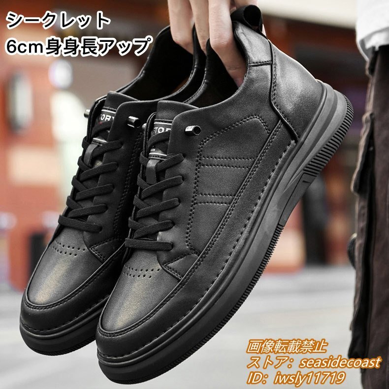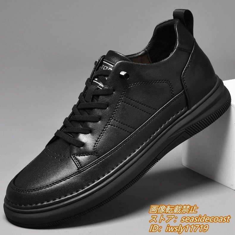 6cm身長アップ★牛革 スニーカー 本革 レザーシューズ シークレット 運動靴 ドライビング ビジネス 紳士靴 男女兼用 白靴 ブラック 24.5cm
