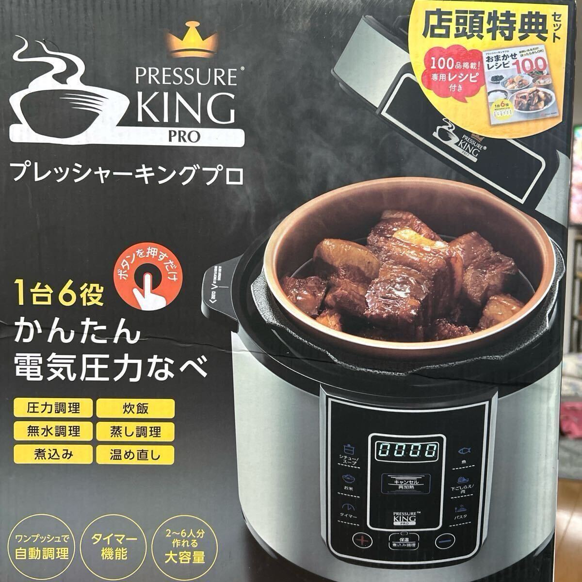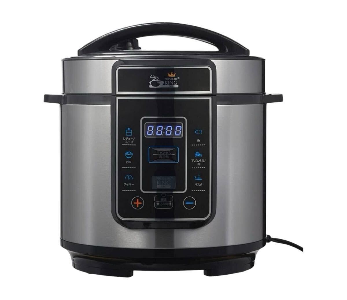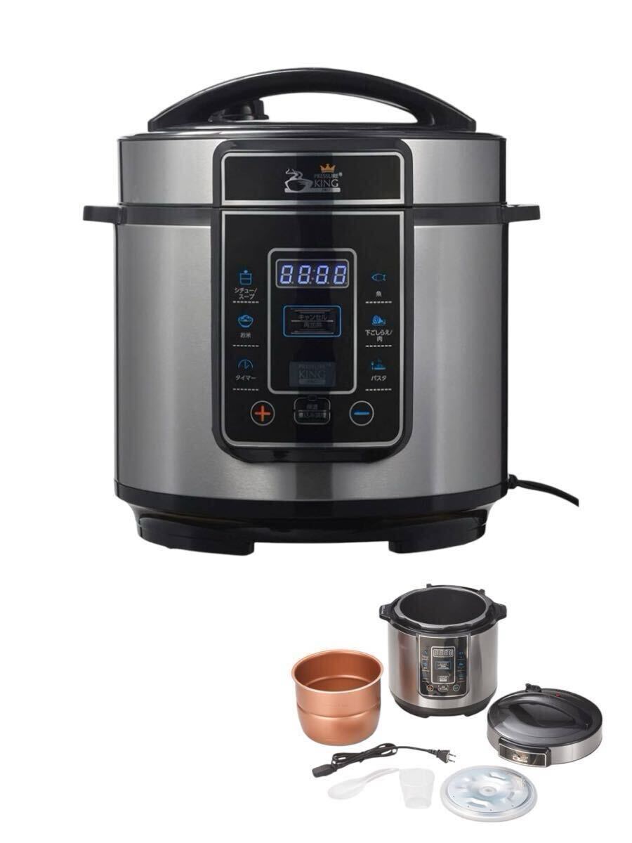 デジタル操作パネルを備えたシルバーの電気圧力鍋、内鍋や計量カップなどの付属品付き。
