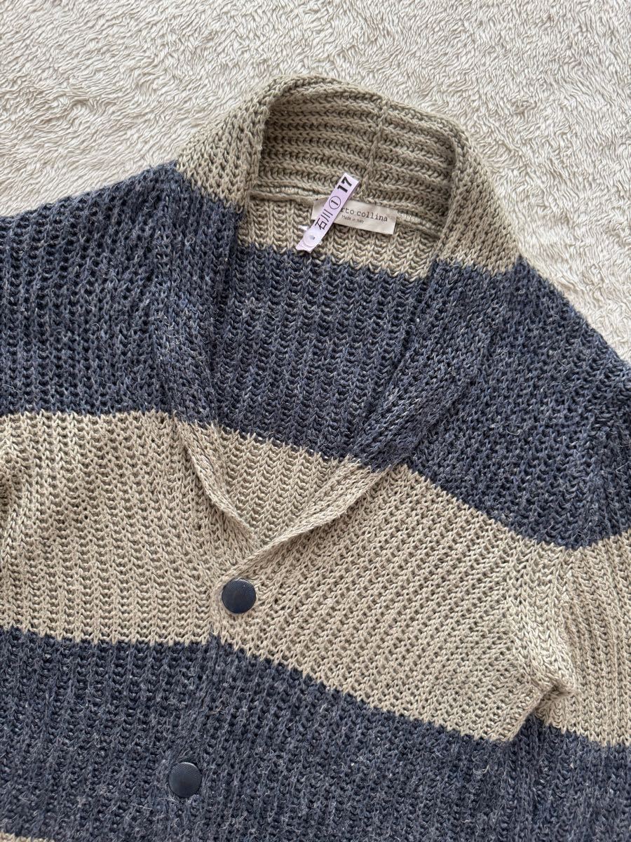 ・風合いの良い上質なリネンニットを使い計算されたモダンなシルエットにジャケットのようなデザインがとてもお洒落なカーディガンになります。